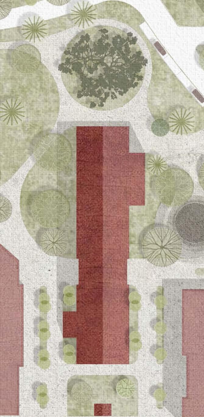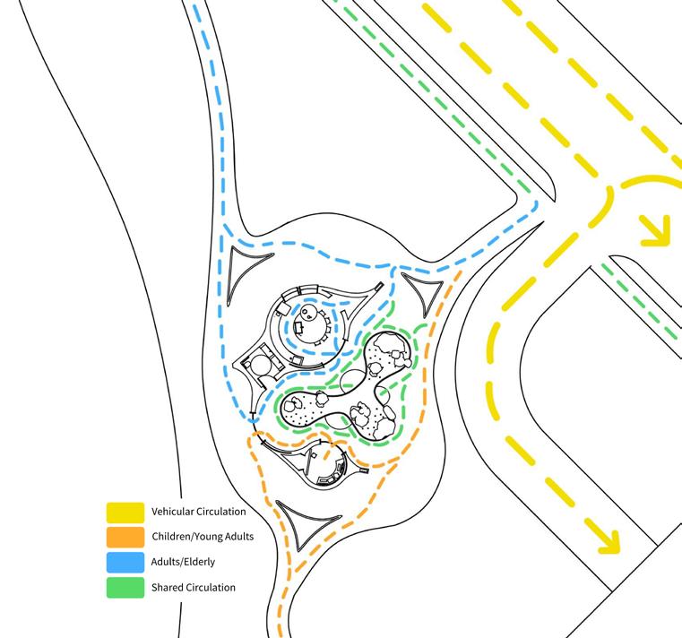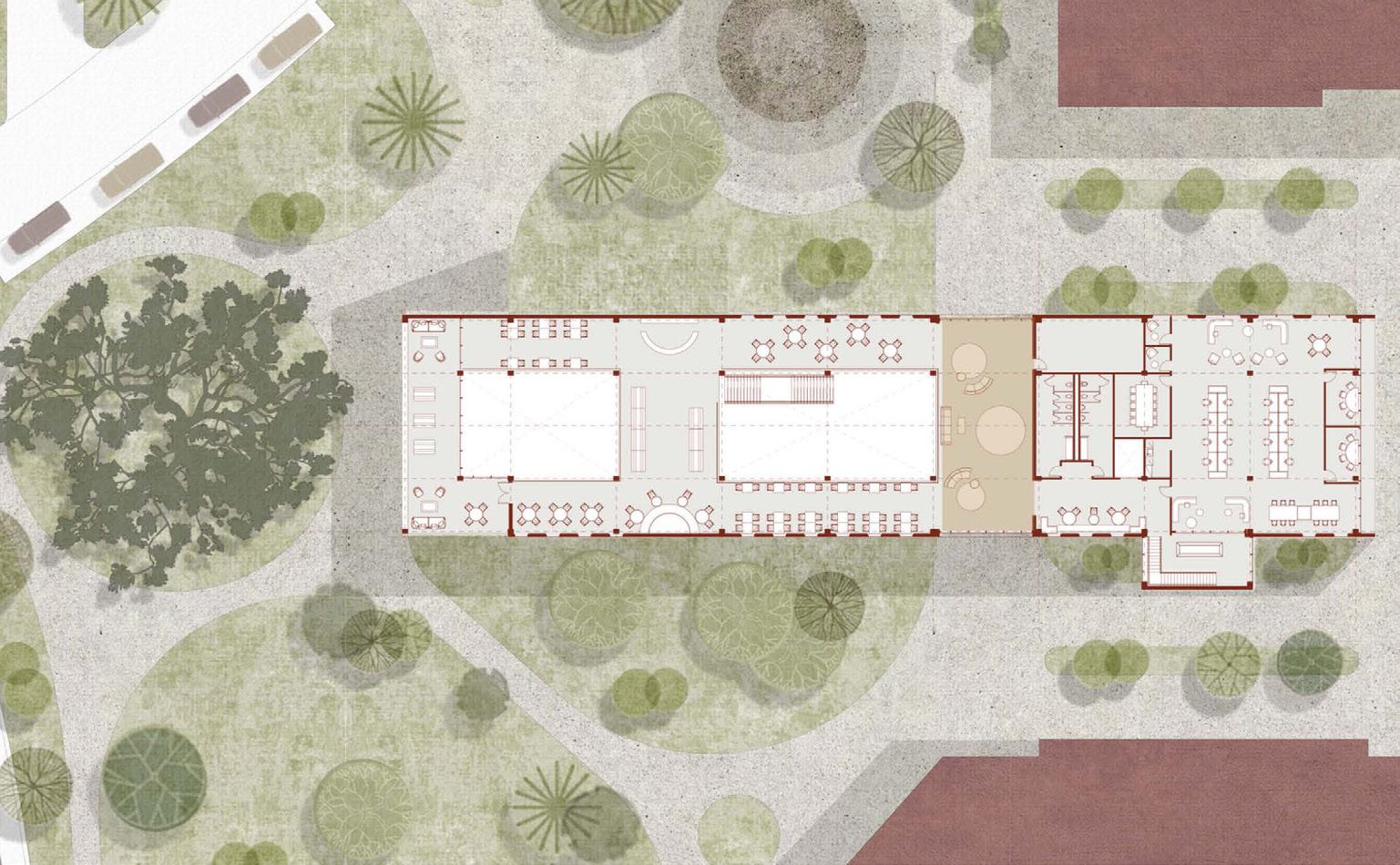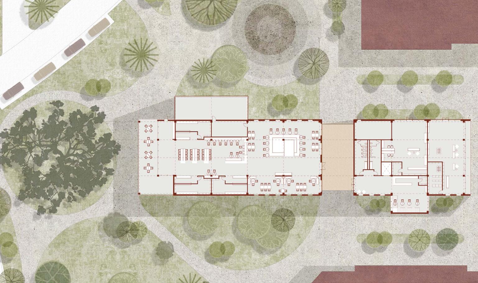 The elderly are a primary focus, playing a crucial role in passing down knowledge by teaching gardening, cooking, and other essential skills, especially with the nearby university offering opportunities to engage college students who may be eager to learn or lack access to such education. The space supports this exchange through a garden for planting and harvesting, a kitchen for transforming fresh produce into meals, and gathering areas for daily activities such as teaching, play, and markets selling uncooked crops, along with essential facilities like restrooms and places for social interaction.