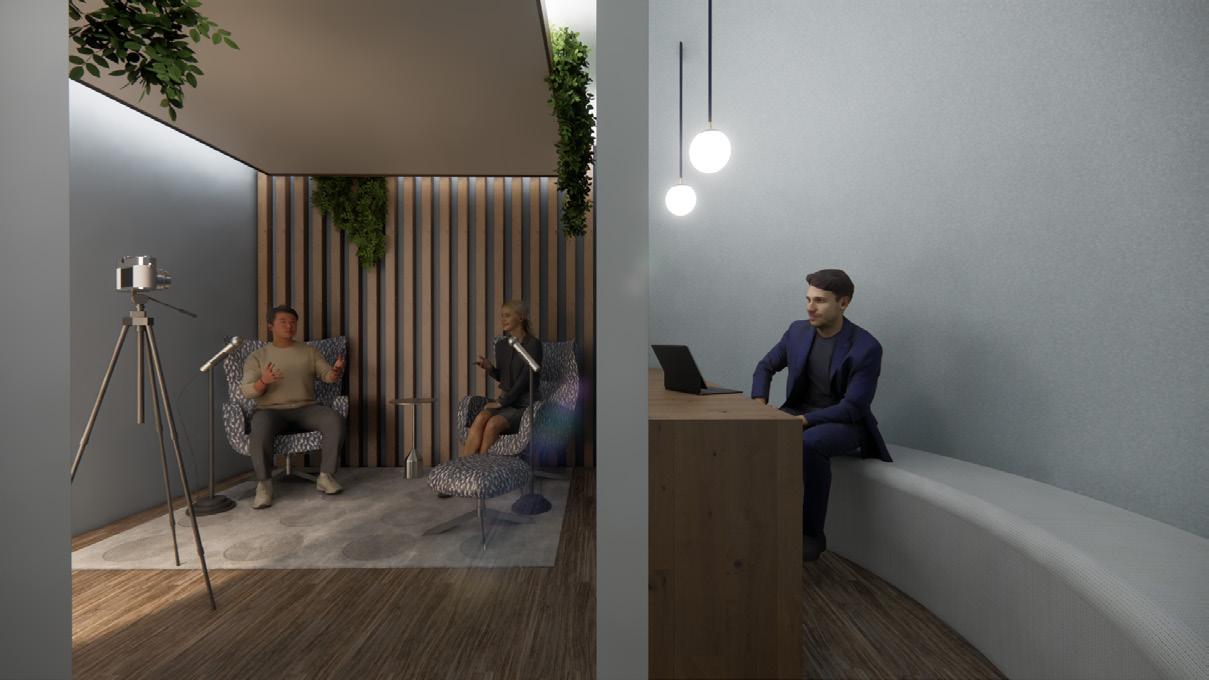 This Sensory Sphere podcast space blends soft lighting, acoustic warmth, and comfortable seating to create a calm, immersive environment for focused conversation and content