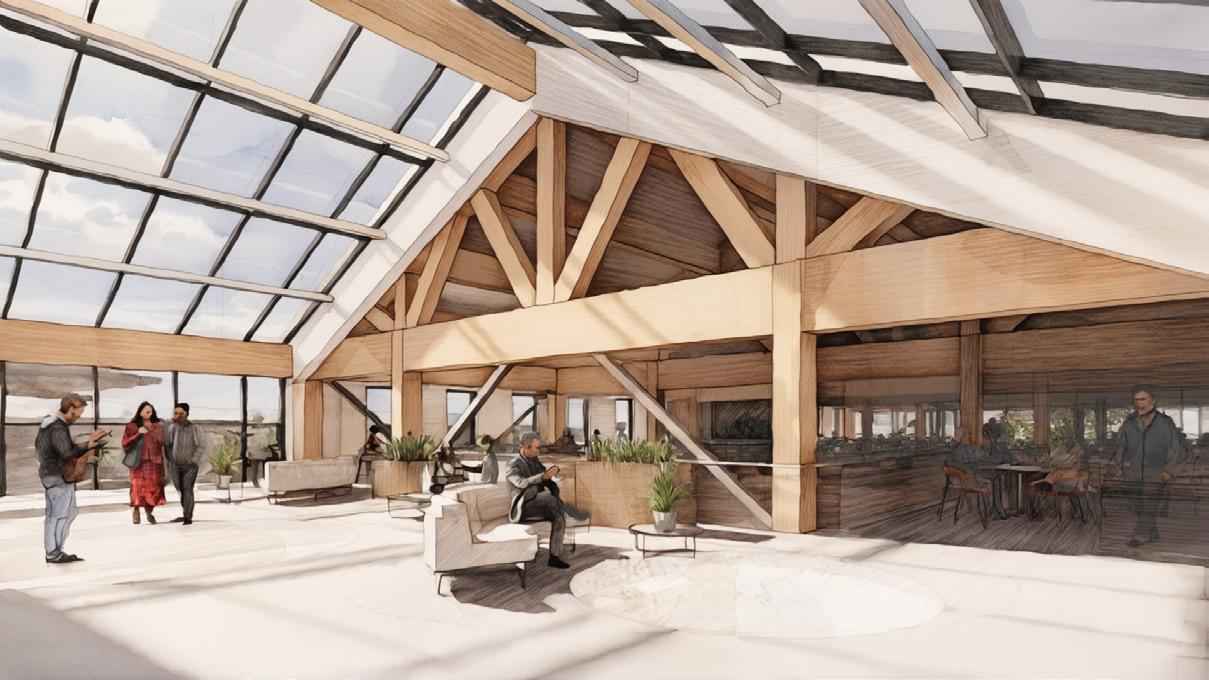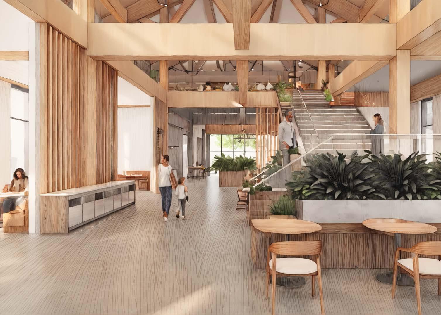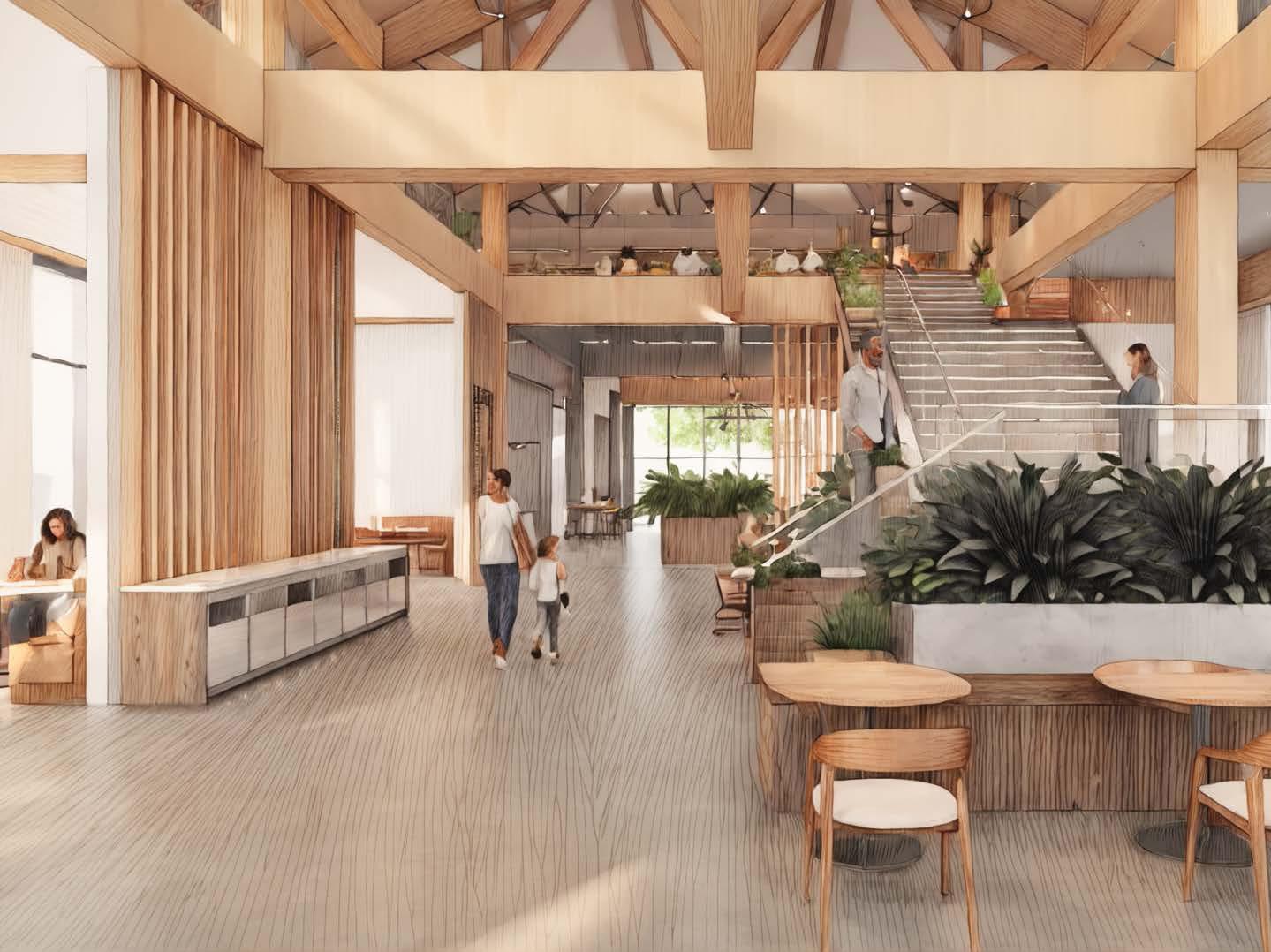 Full-height windows, a glass roof, and circular light wells connect the space to the event energy, the food hall’s warmth, and framed views of the barn beyond