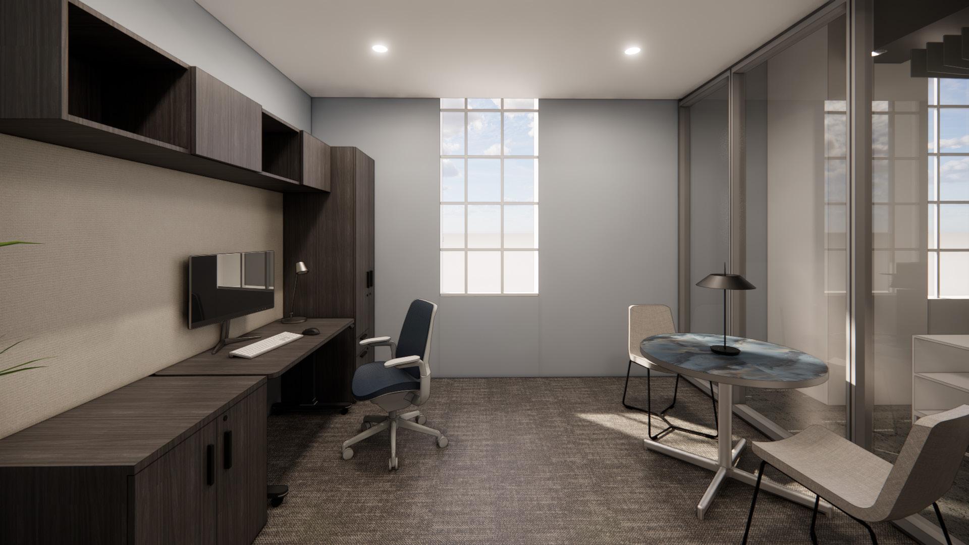 This open workstation space features soft, diffused lighting and semi-enclosed desks that create a focused yet collaborative environment for everyday work.