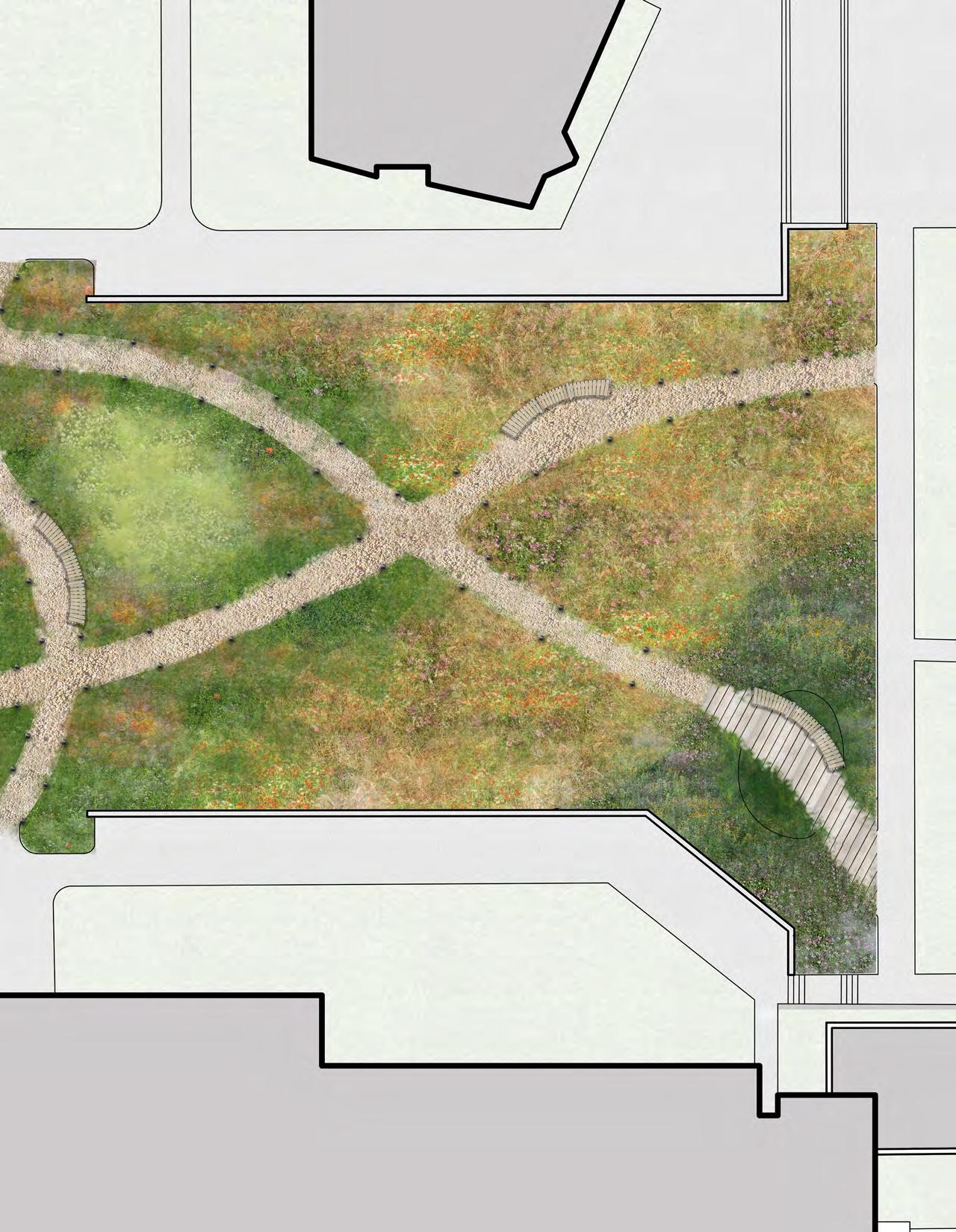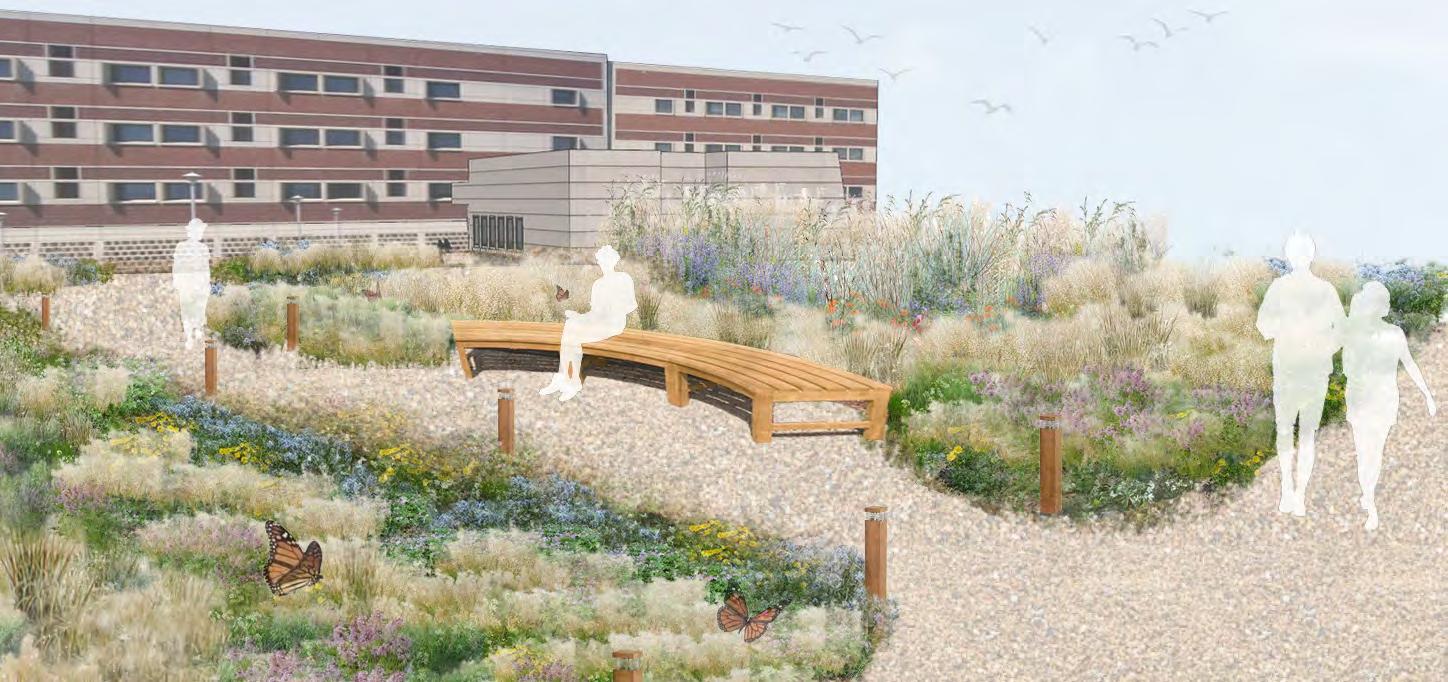 The design will create a habitat for pollinators and other small native animals. The plant species have differing bloom times to provide a year round experience. The site is enhanced with curved benches tucked into each meadow type so visitors can rest and enjoy nature.