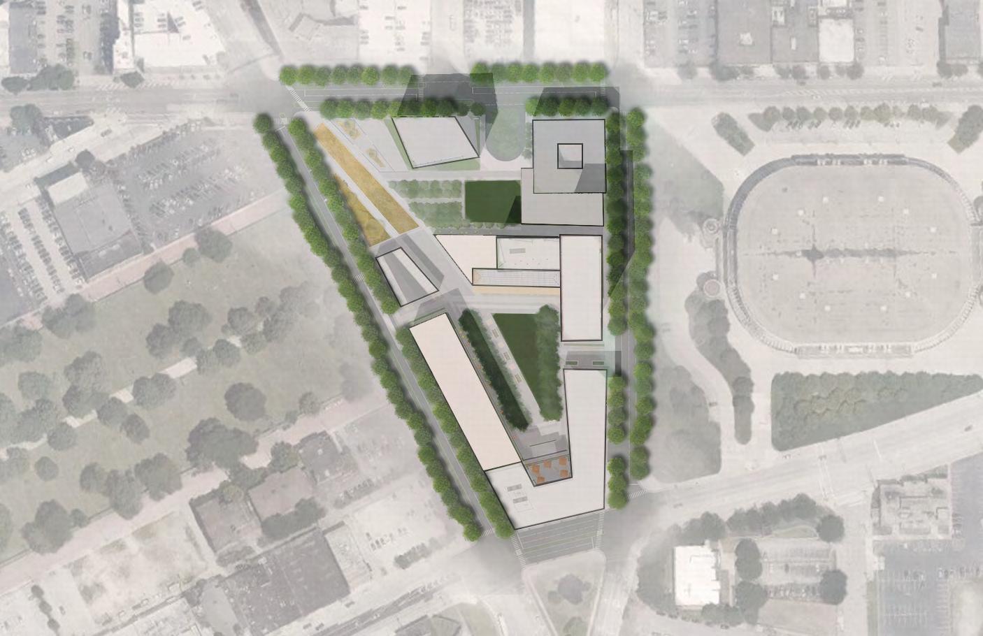 The design choices for this project were directly inspired by the unique surrounding context and historical design practices of Cleveland’s past. An entry mall draws people into the site, then they are greeted by the market building and art co-op, and the site terminates at an interior piazza which is lined with mixed use buildings. With the site being located one block from playhouse square, Cleveland’s premier theatre district, and in close proximity to the regional interstate, this made it possible for a dynamic mixed use community of people to live or gather.
