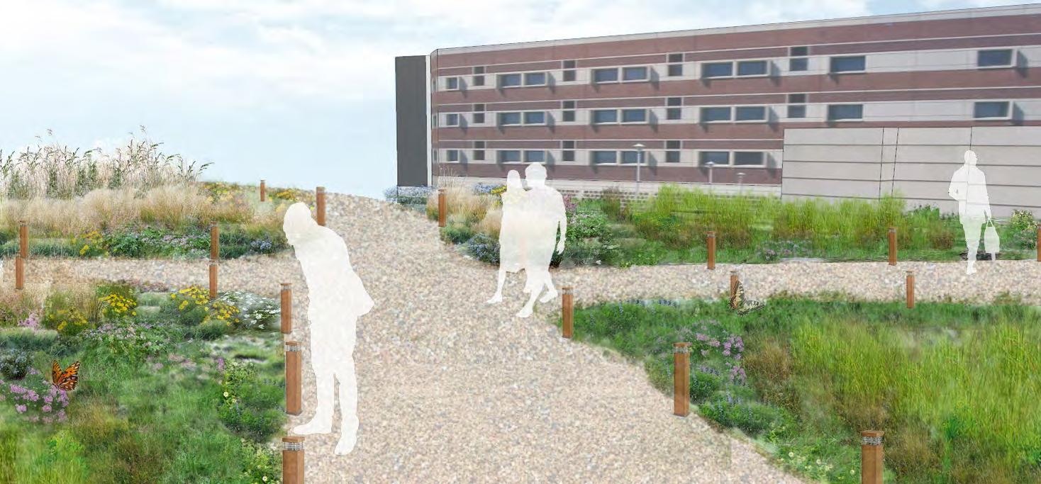 The vibrant meadow establishment and ecology will serve as a valuable learning environment for students, faculty, and visitors on campus. Educational features will include meadow ecology, pollinator facts, and native plant species.