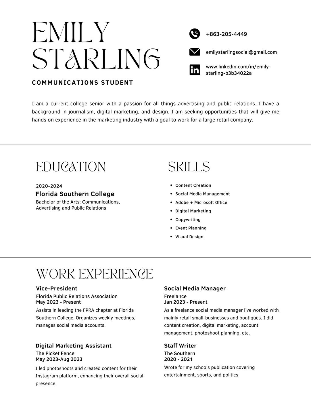 I am a current senior at Florida Southern College where I study Communications with a focus in Advertising and Public Relations, along with a Marketing minor