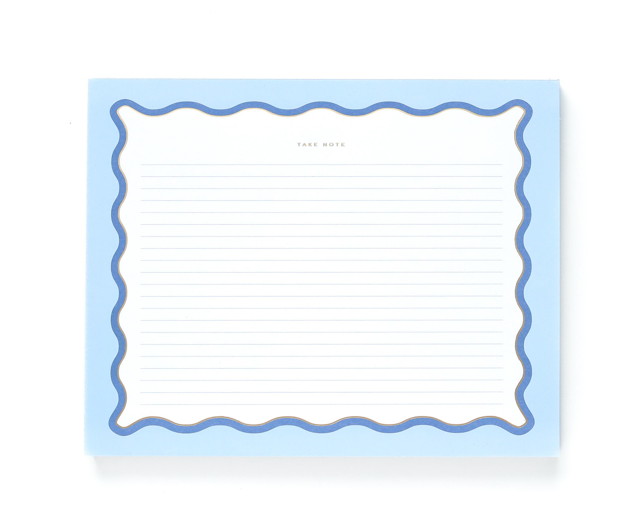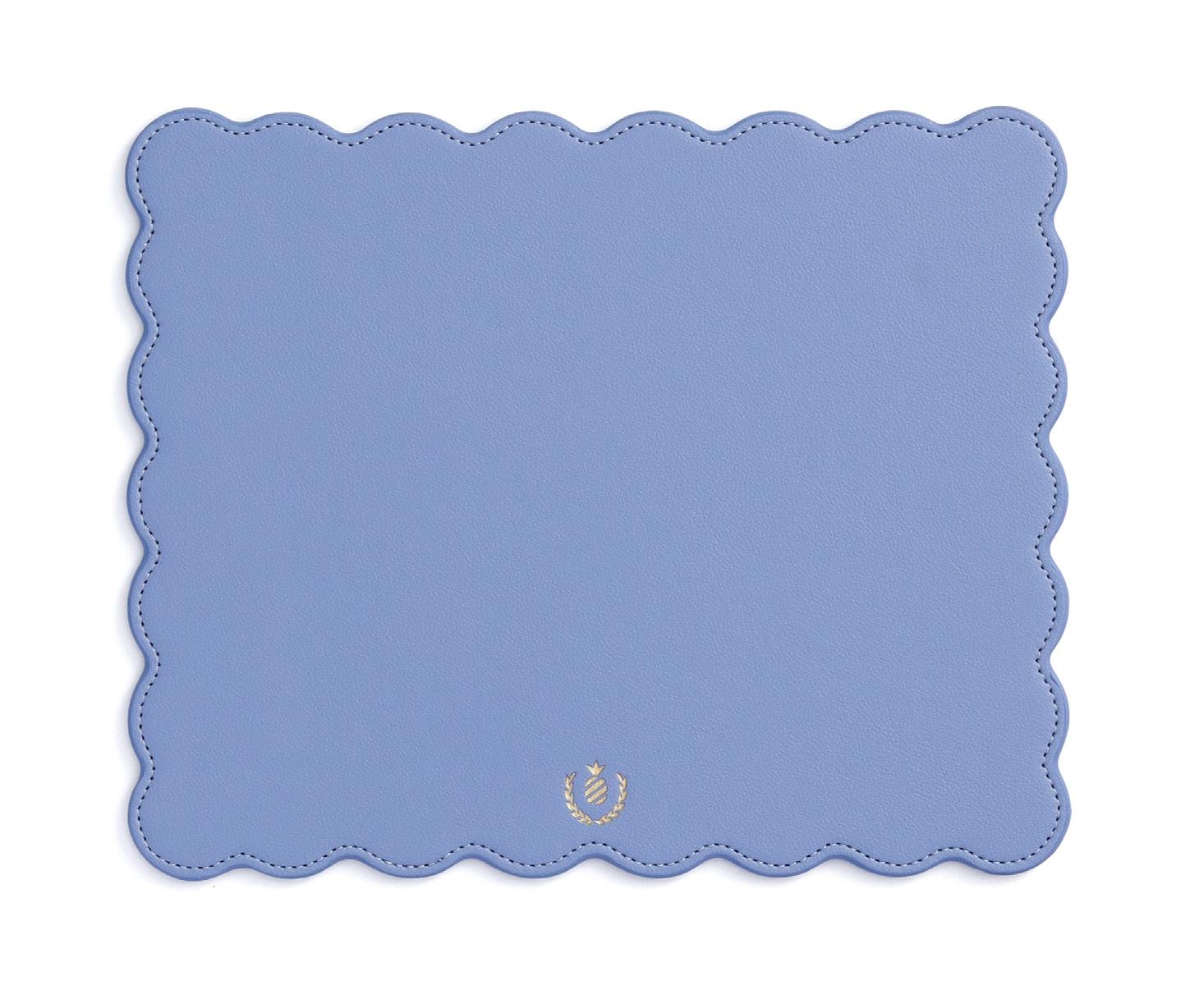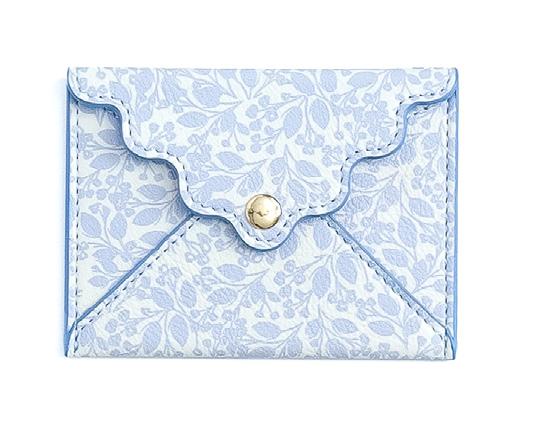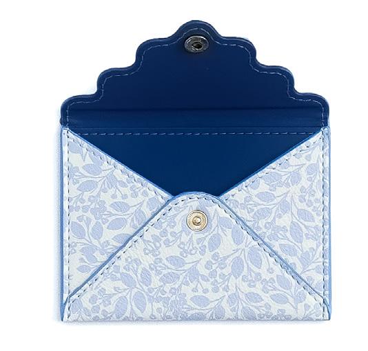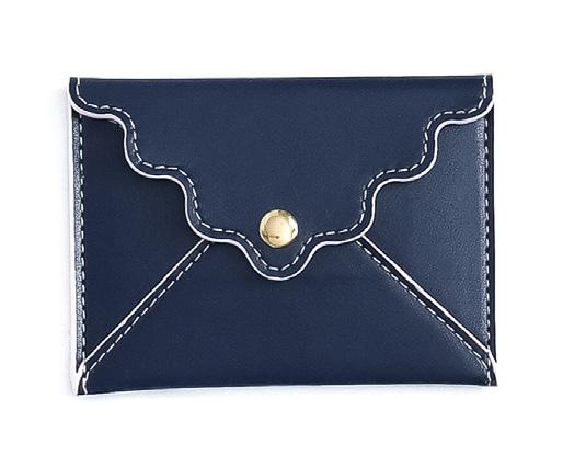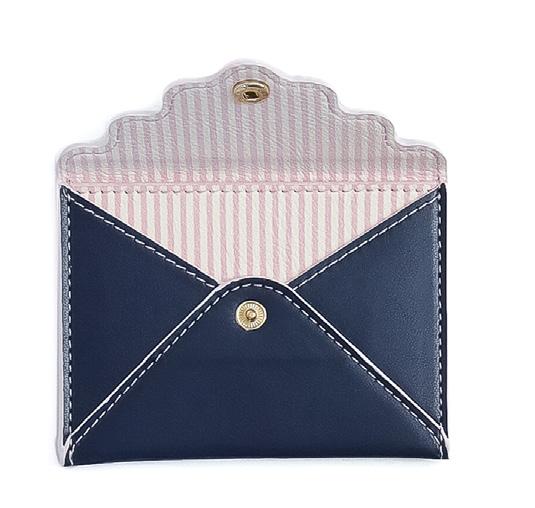 Leatherette mini wallet measuring 4.25 x 3” featuring scalloped edging, gold snap-button closure, 2 interior sections, and gold foil logo. Packaged in a cello bag with a gold foil label.