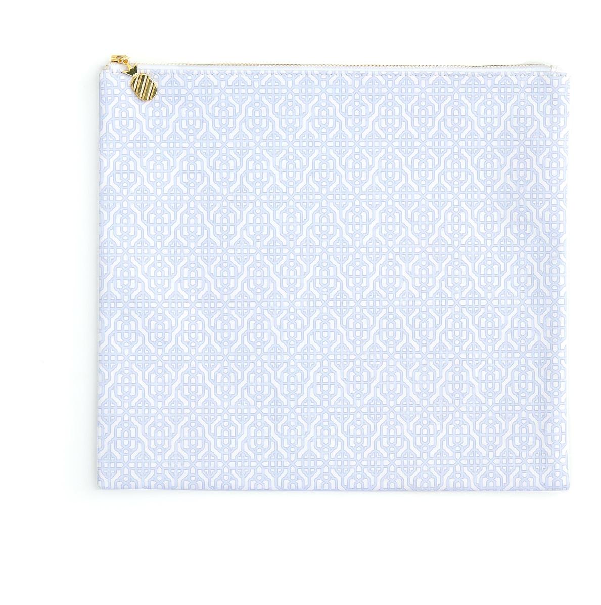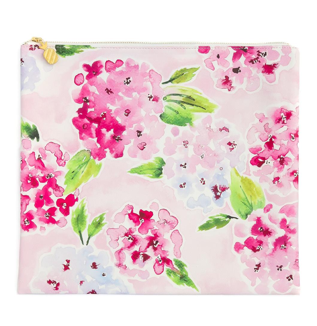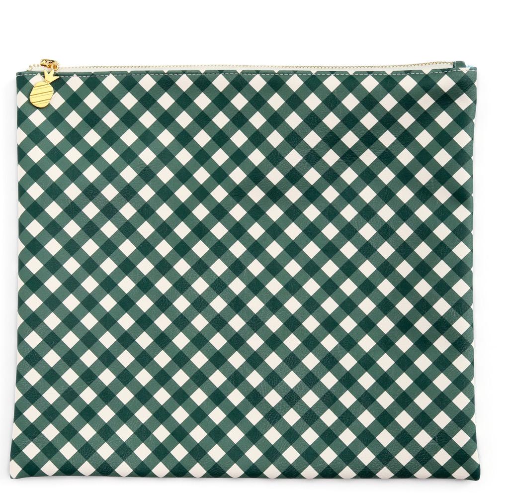 11.9 x 13”, leatherette exterior with fabric liner, gold zipper, and pineapple zipper pull