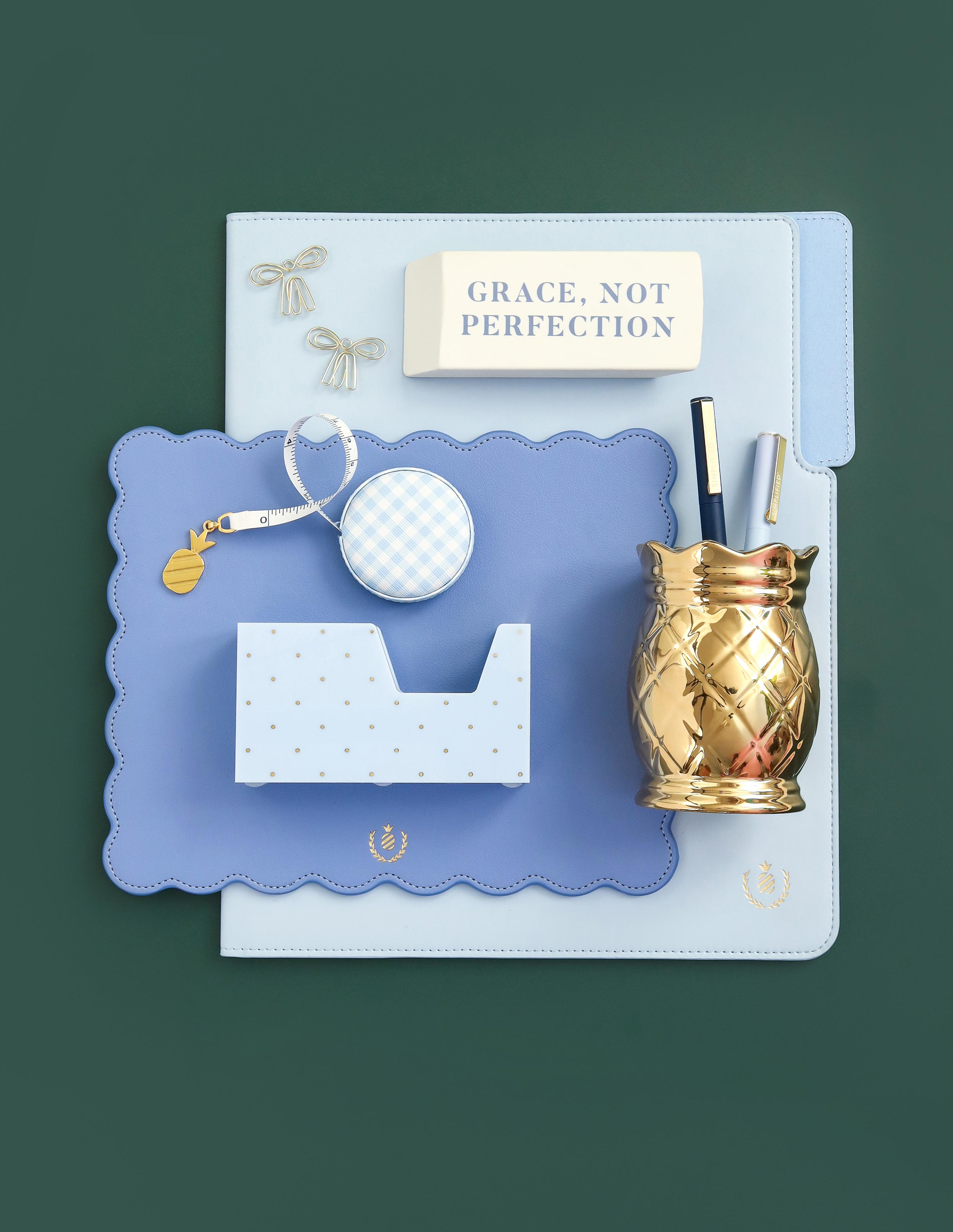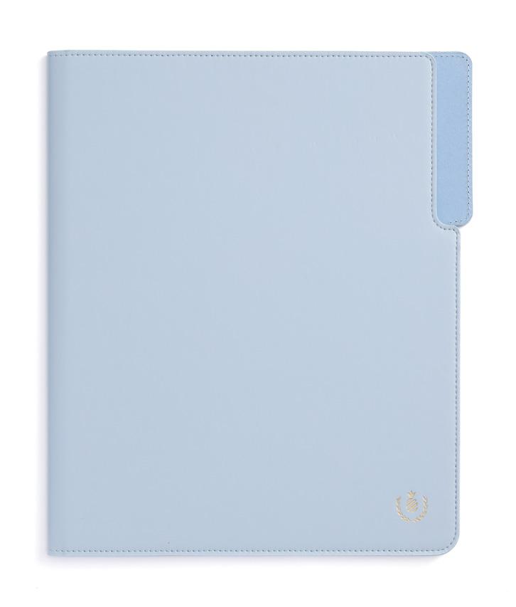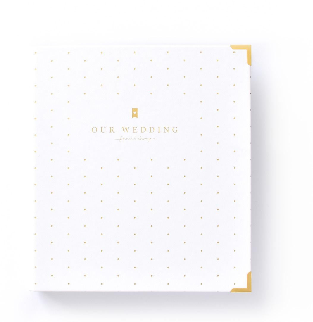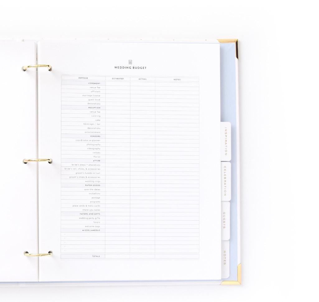 This undated, binder-style planner features a white leatherette cover with a gold foil dot pattern and gold foil details, gold protective corners, a Carolina blue inside liner and pocket, a sticker sheet, 6 sections with lots of pages and worksheets, and luxurious, pure white paper. 10.5” x 11.6” x 2” binder inside a keepsake box.