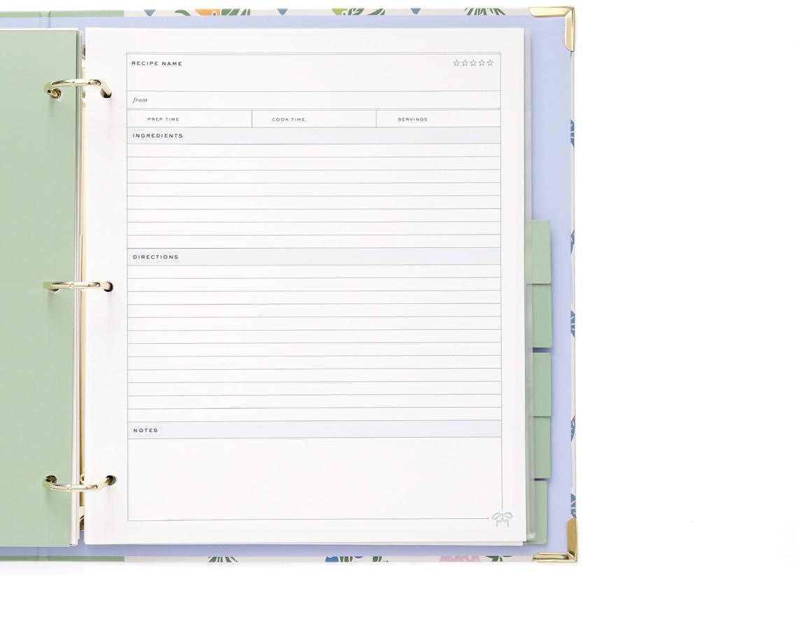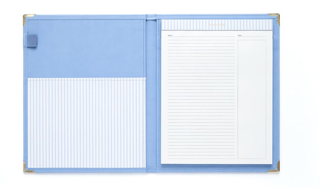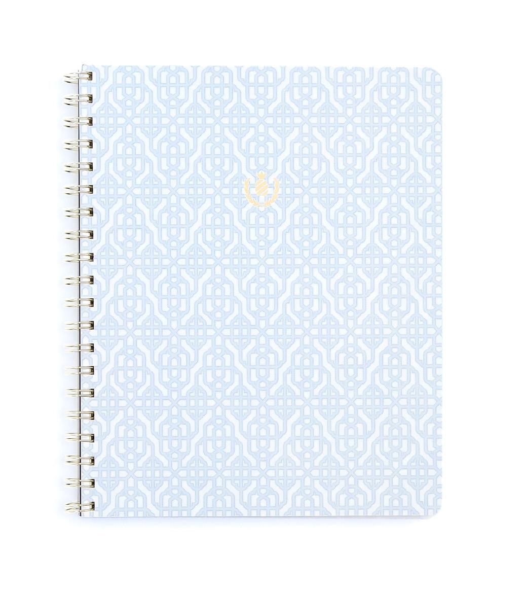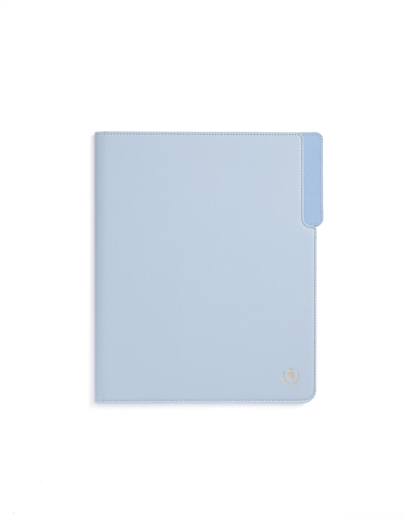 This undated, binder-style planner features a white leatherette cover with a gold foil dot pattern and gold foil details, gold protective corners, a Carolina blue inside liner and pocket, a sticker sheet, 6 sections with lots of pages and worksheets, and luxurious, pure white paper. 10.5” x 11.6” x 2” binder inside a keepsake box.