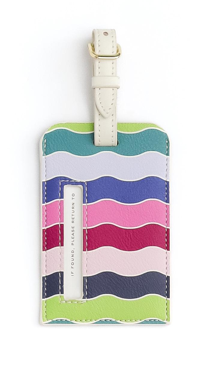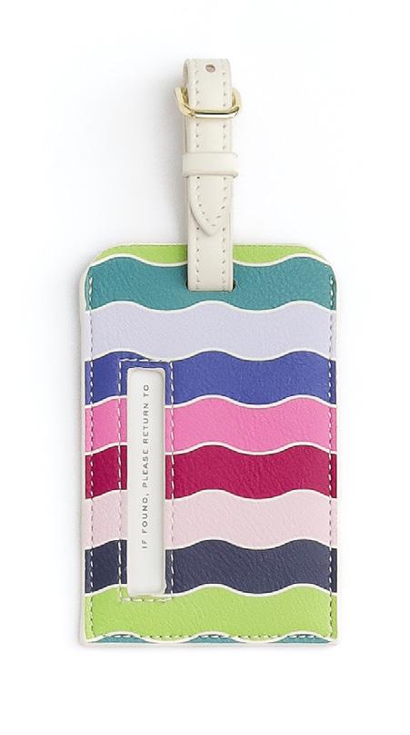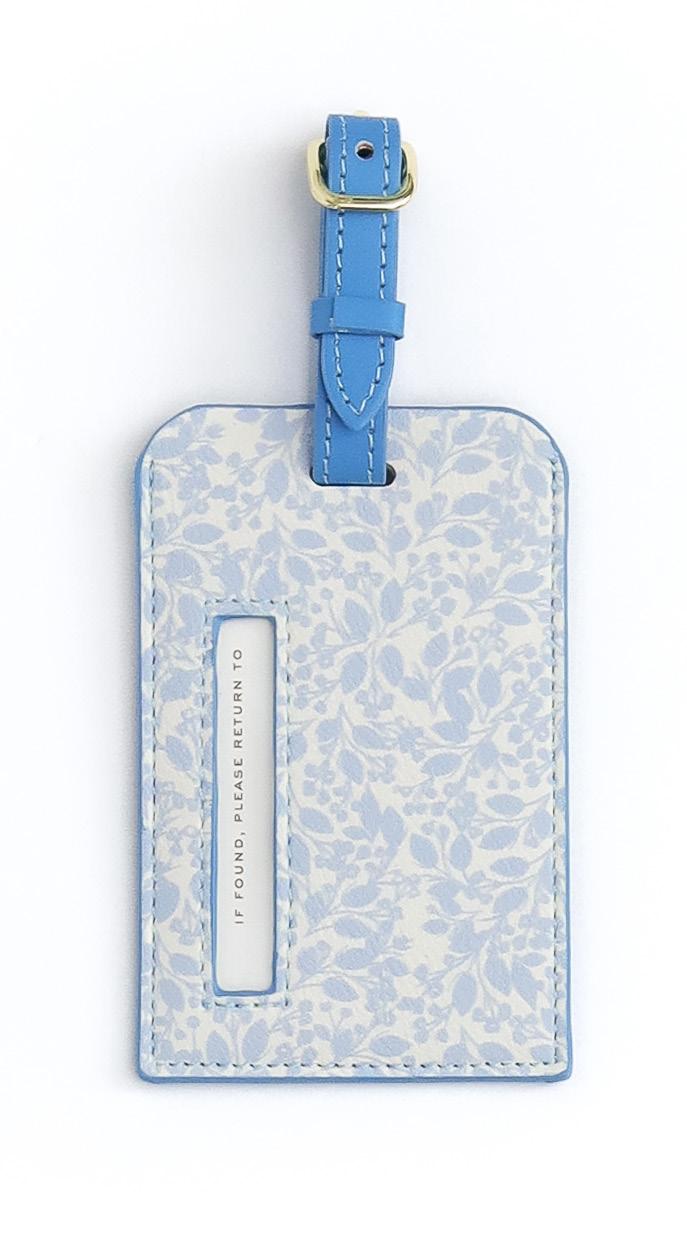 Leatherette luggage tag measuring 2.75 x 4.33” featuring gold hardware and removable, double-sided informational card. Packaged in an ivory box with gold foil details.