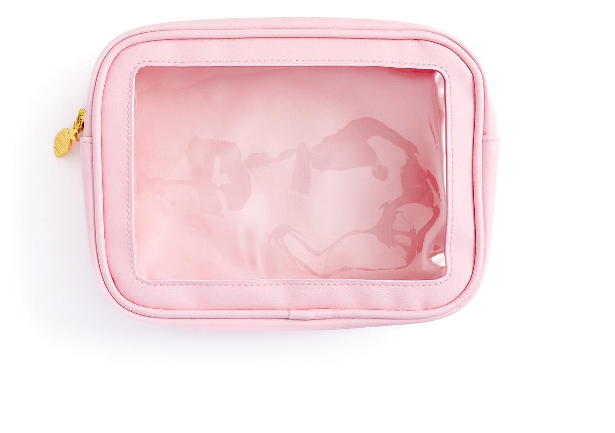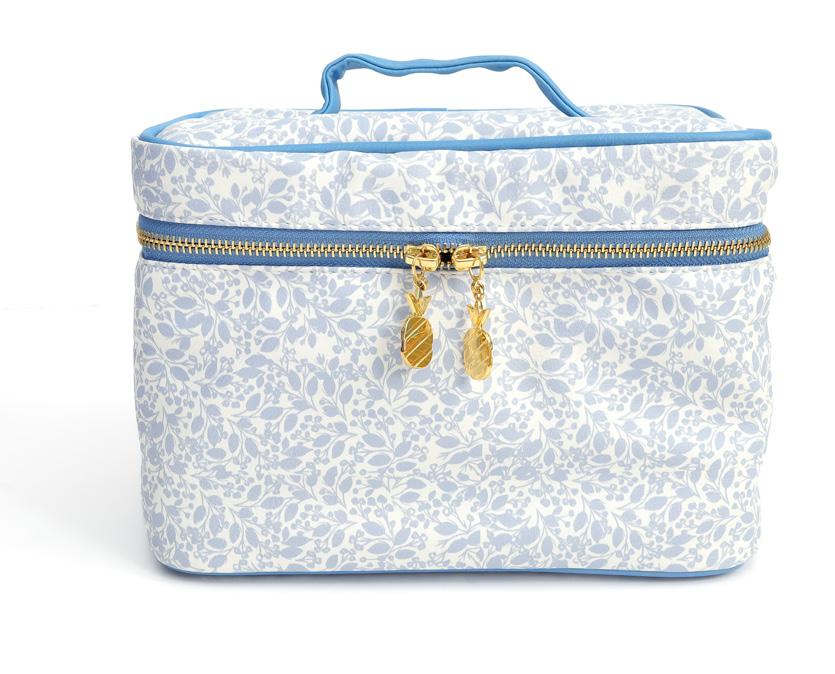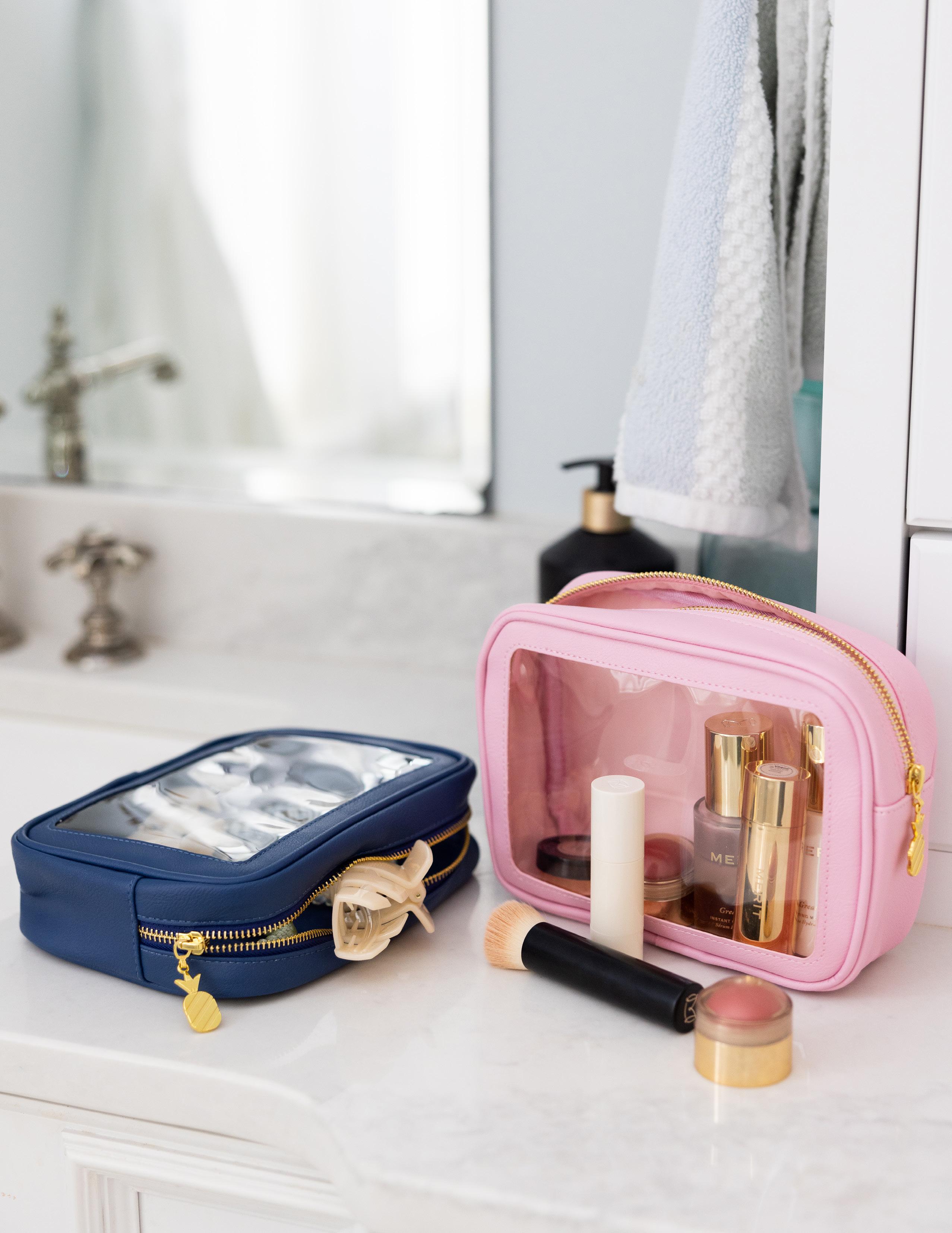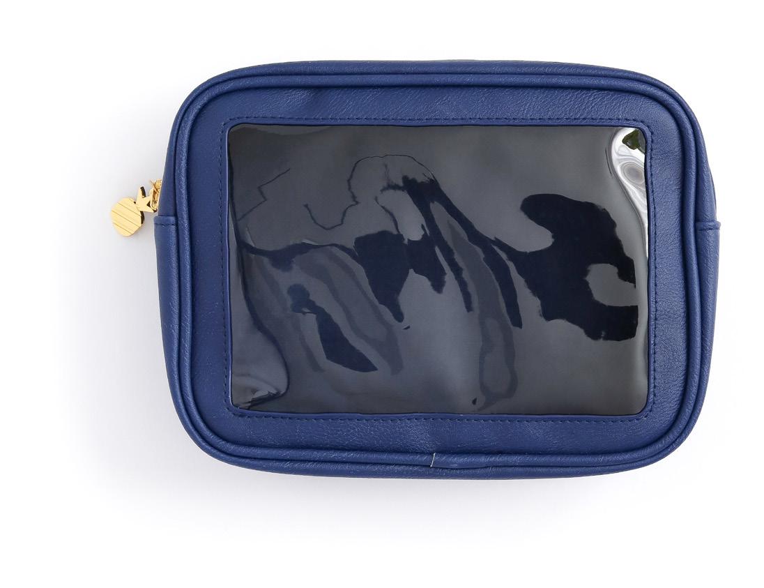7.5x 5.5 x 2.2” leatherette bag with clear window, gold foil logo, gold zipper, and gold pineapple zipper pull