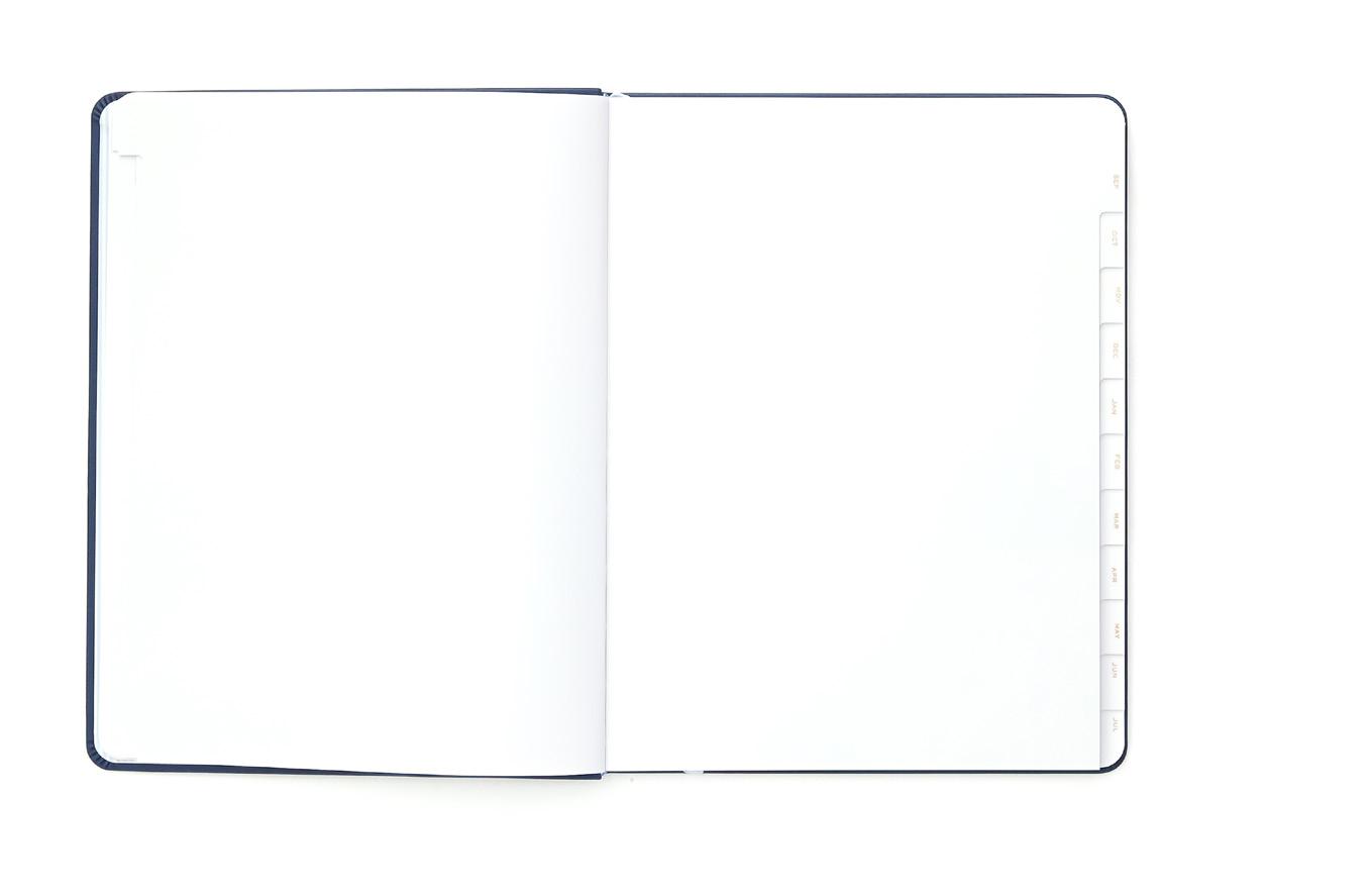 Our Bookbound Daily Dapperdesk Planner is simple, elegant, and polished. Featuring a bookbound, lay-flat binding, a luxurious vegan leather cover, white mylar tabs with gold foil details, a grosgrain ribbon page marker, and a day-per-page format, Dapperdesk’s minimal and beautifully designed pages serve as a fresh start every day. The Bookbound Daily Dapperdesk edition measures