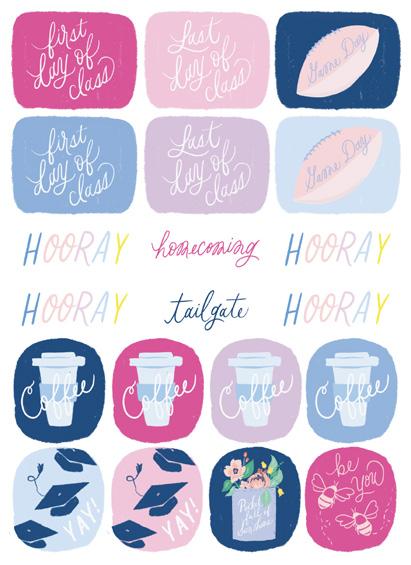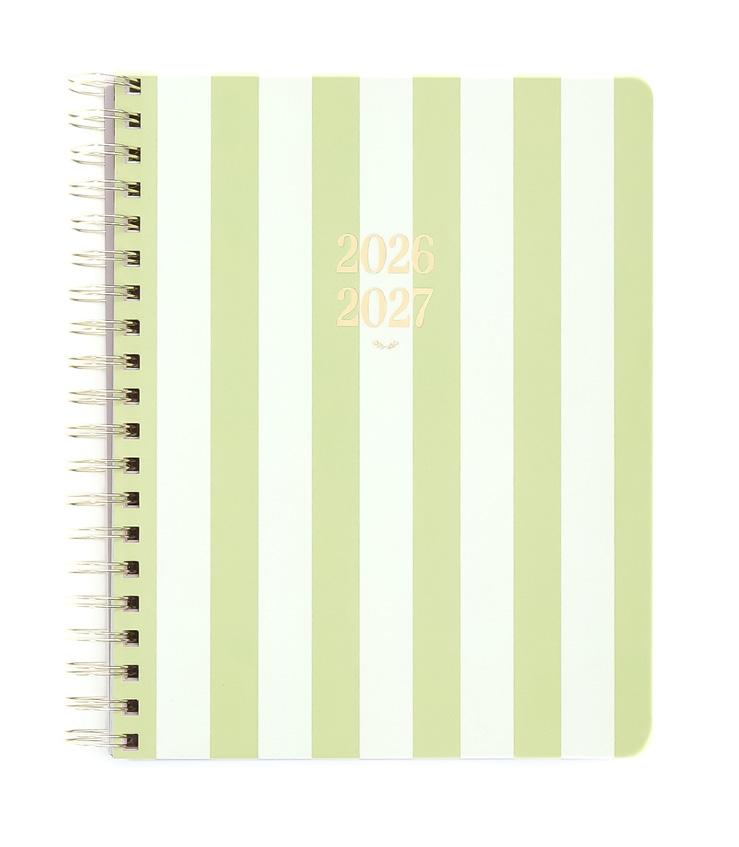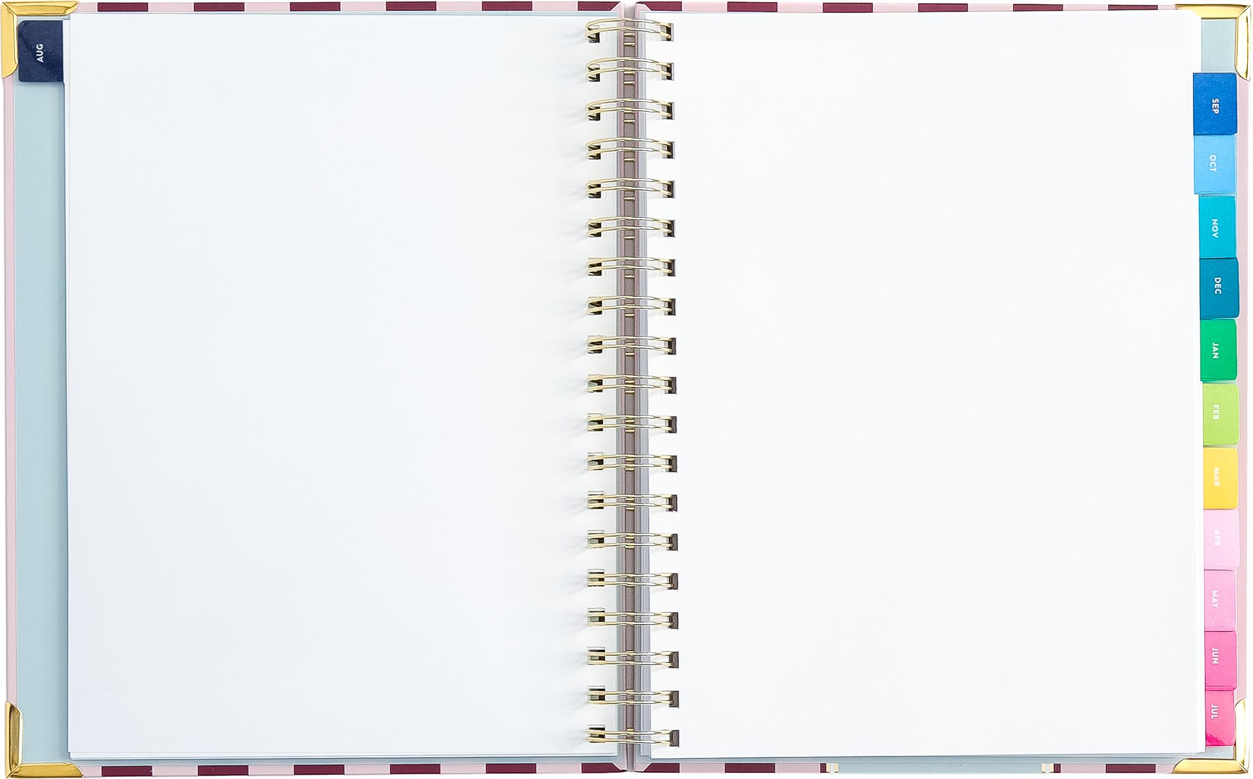 Dated softcover planner measuring 7.75 x 10”, featuring gold wire-o binding, 152 black-and-white pages, printed monthly tabs, and a full-color sticker sheet. Packaged in a cello bag with a gold foil label. Available in two editions—Academic (Aug-Jul) and Calendar (Jan-Dec), each with two cover designs.
