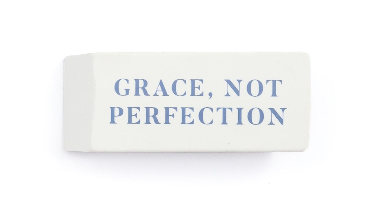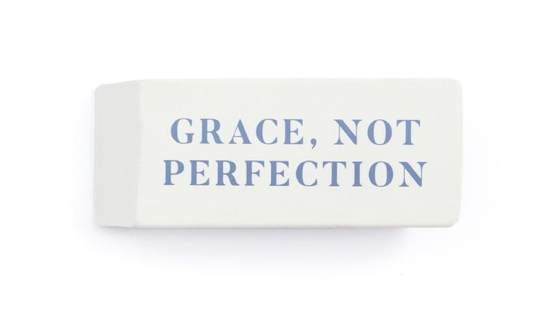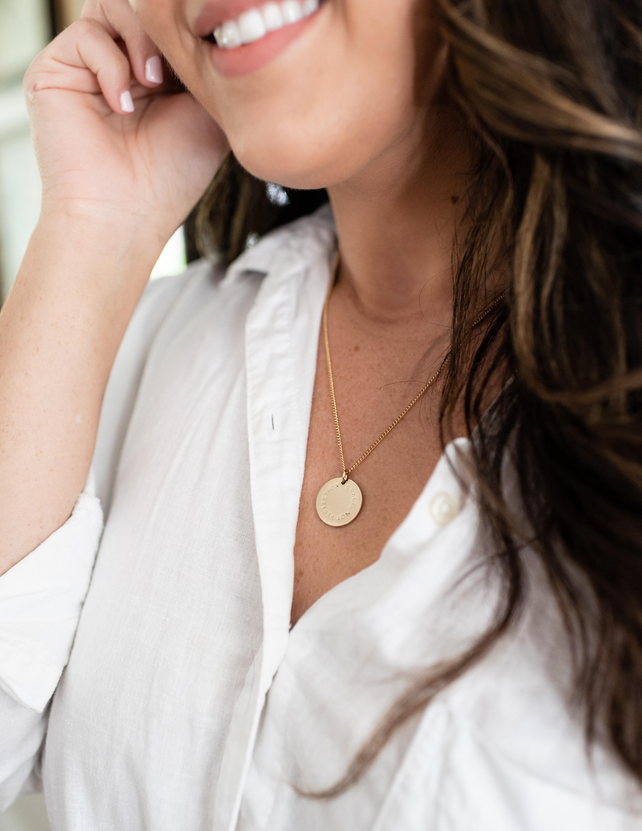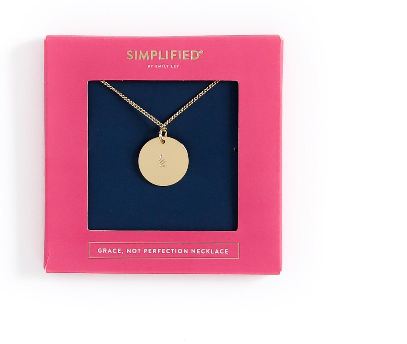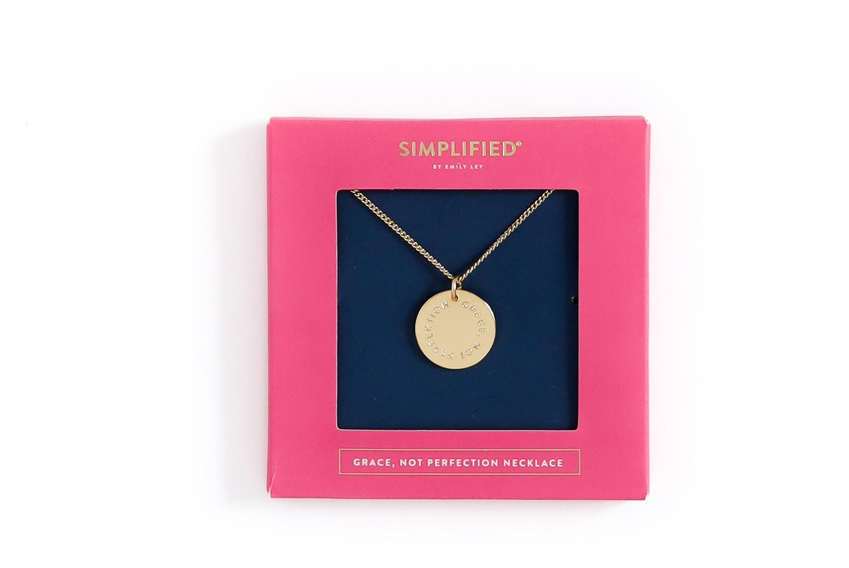 24K gold-plated brass pendant measuring .75” with “Grace Not Perfection” engraving on an 18.5” 24k gold-plated brass chain with 2” extender