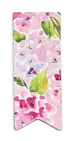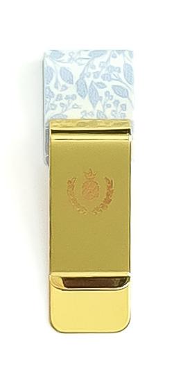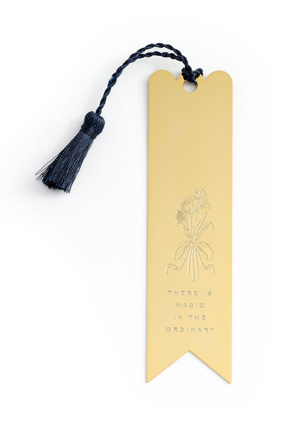 Gold metal bookmark measuring 4.7 x 1.25” with an engraved design and navy tassel BMK001