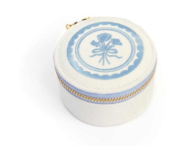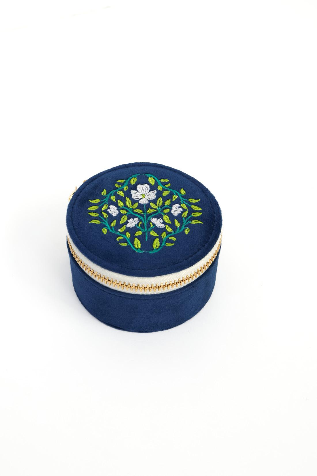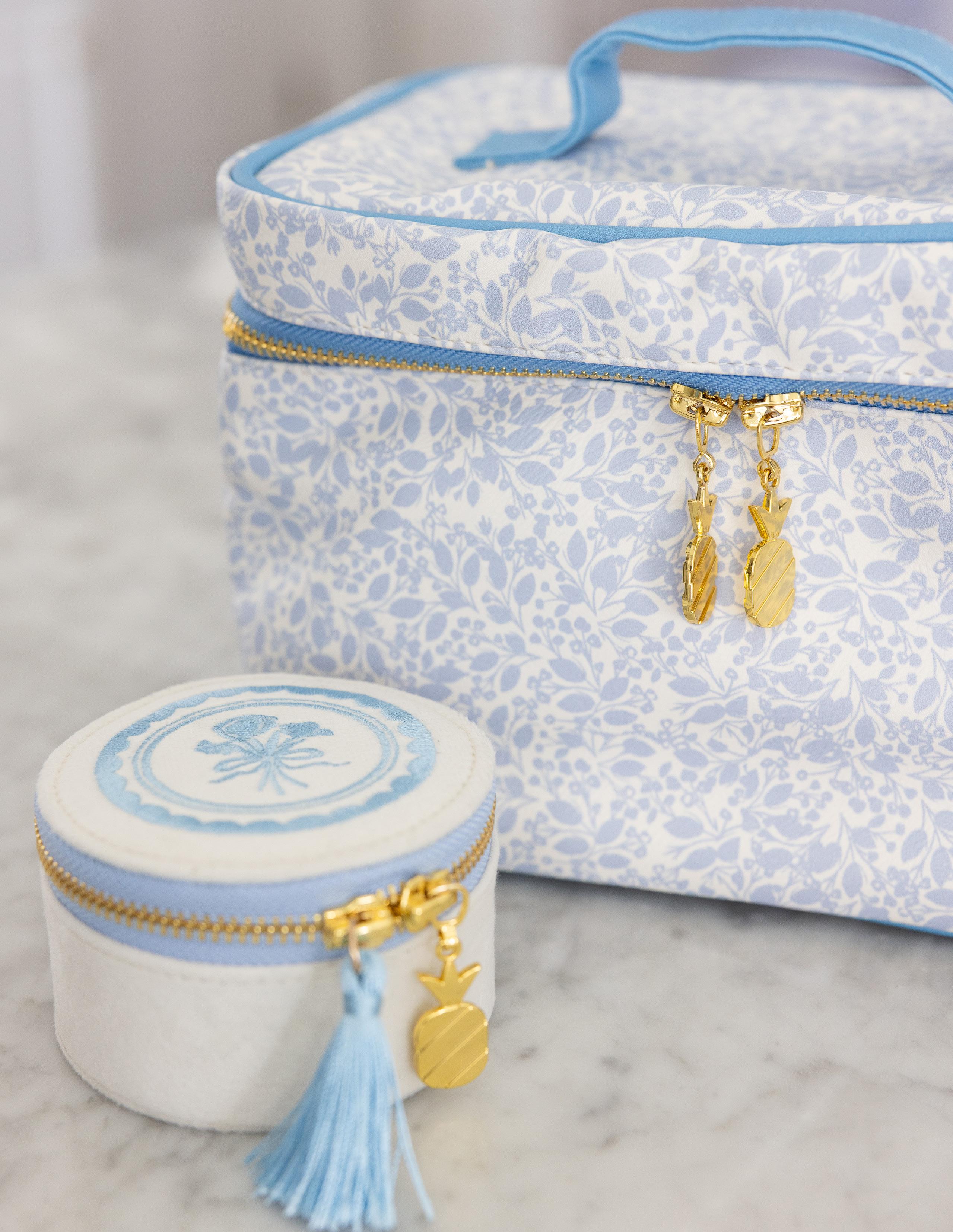 Embroidered velvet jewelry organizer, perfect for travel! Features gold zipper teeth, pineapple zipper pull, tassel detail, and interior sections. Measures 1.5” tall x 3” diameter.