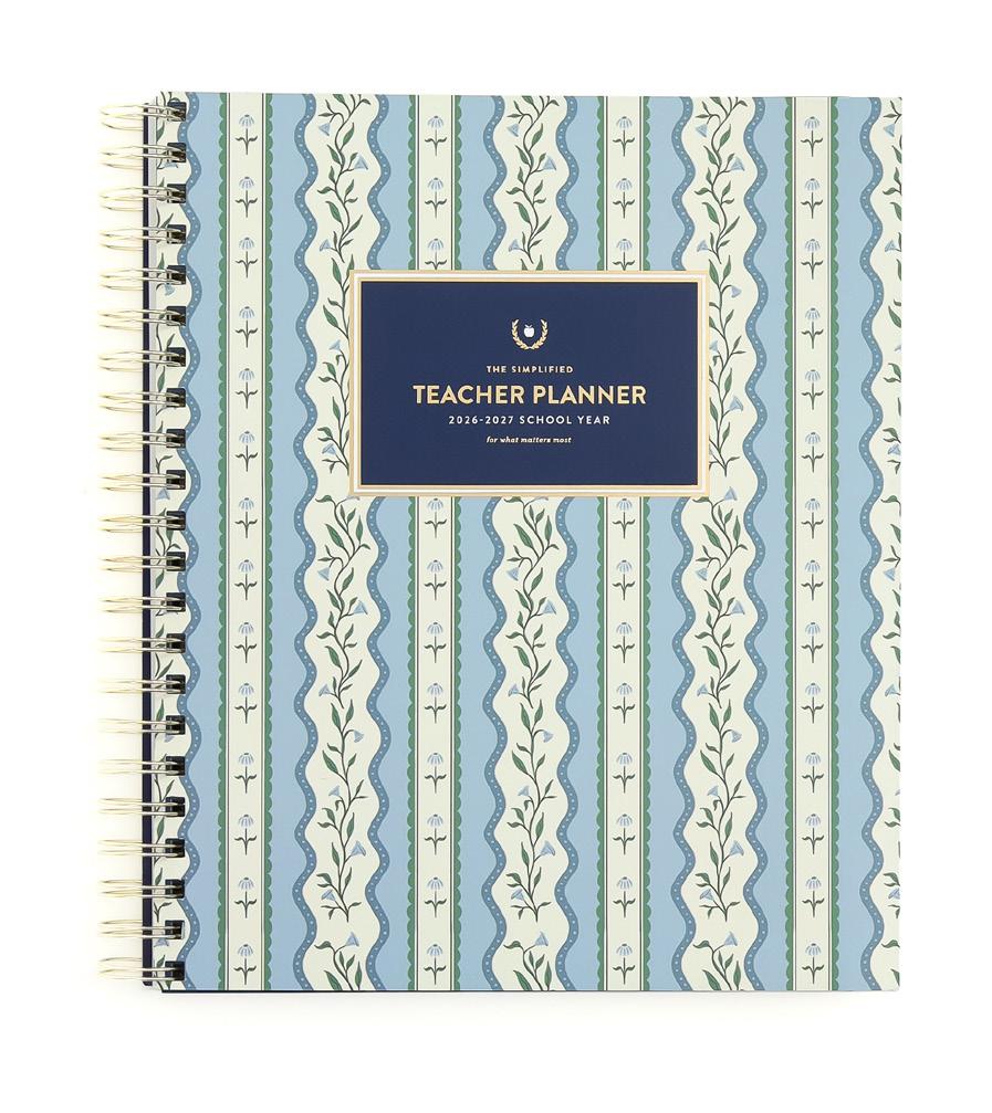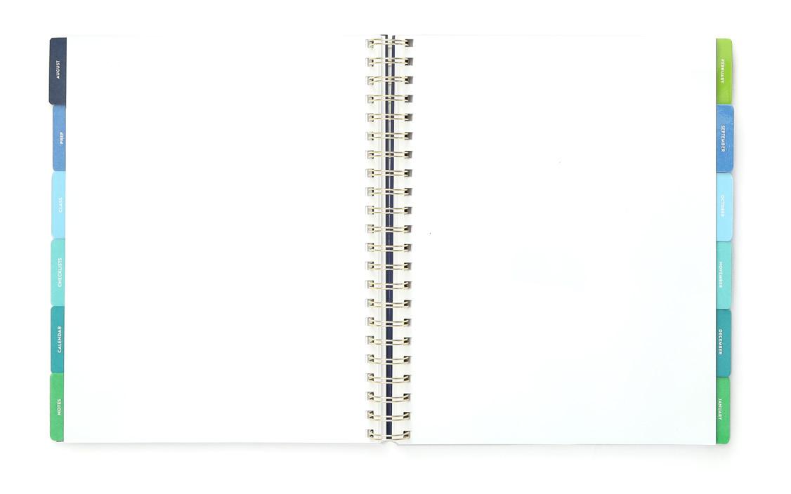 Dated softcover teacher planner measuring 8.5 x 11”, featuring gold wire-o binding, 164 full-color pages, printed monthly tabs, and a three full-color sticker sheets. Packaged in a cello bag with a gold foil label.