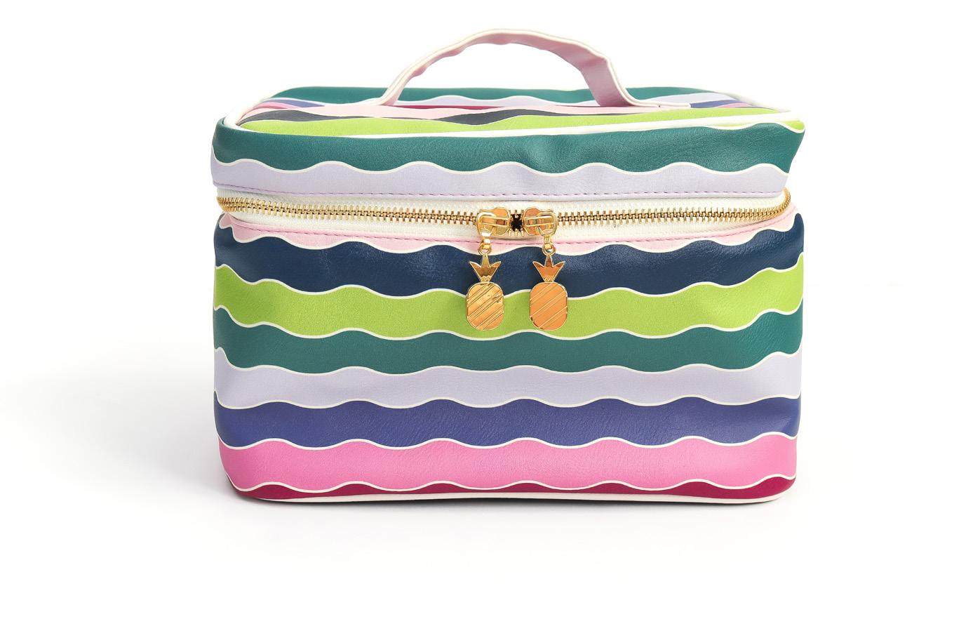 Set of two travel bags with colorful design, gold zipper, and gold pineapple zipper pull. Large bag measures 9 x 6 x 6.5” with leatherette exterior and piping details, soft protective padding layer, and printed cotton inside liner. Features multiple interior compartments with both fixed and elastic materials. Medium bag measures 7 x 5 x 1.5” and features TSA-compliant clear sides with printed leatherette trim. Packaged in a cello bag with gold foil tags.