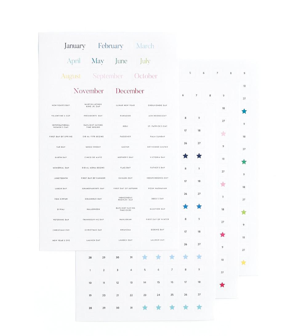 Dated softcover planner measuring 6.25 x 8.5”, featuring gold wire-o binding, 152 black-and-white pages, printed monthly tabs, and a full-color sticker sheet. Packaged in a cello bag with a gold foil label. Available in two editions—Academic (Aug-Jul) and Calendar (Jan-Dec), each with two cover designs.