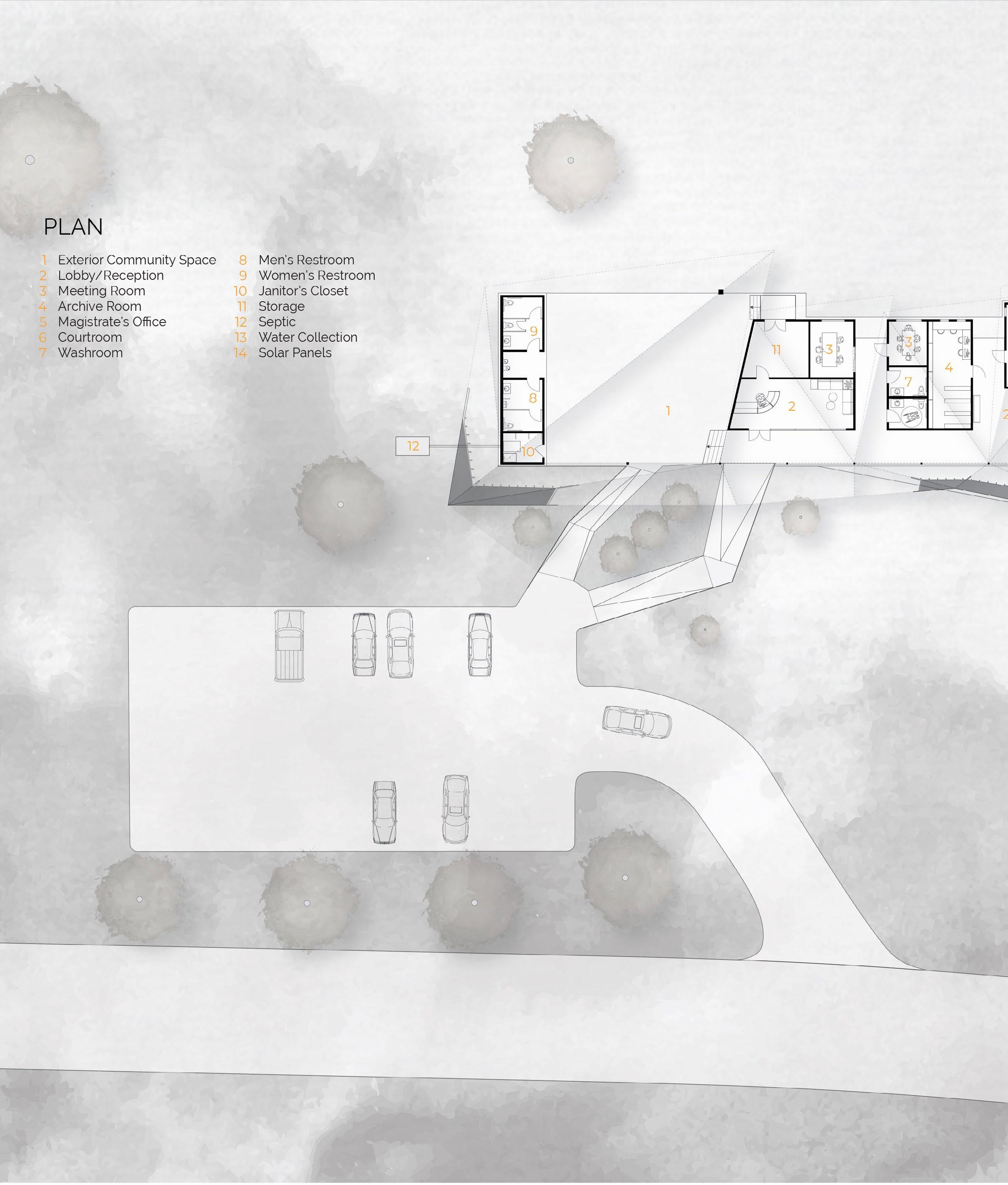 Given the program’s nature and the region’s hot climate, the courthouse is designed to operate off-grid, incorporating a range of active and passive design strategies. Active strategies include solar panels for energy generation, rainwater collection systems for water supply, and septic systems for waste management.