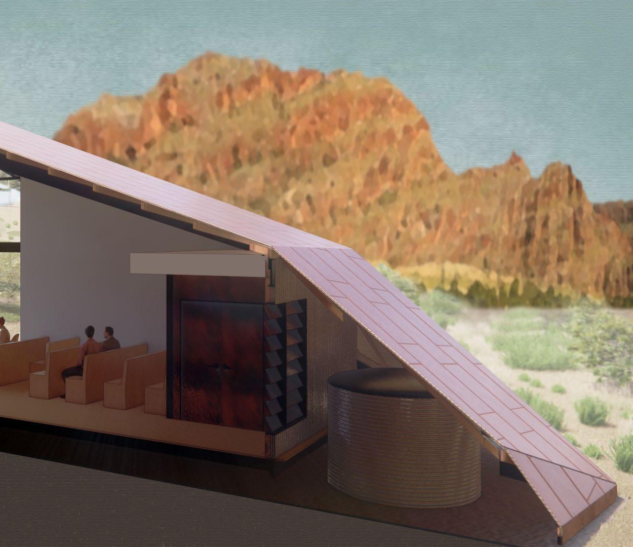 The red aluminum paneling mimics the iconic bluffs of the Australian Outback. The material not only captures the earthy hues that characterize the landscape, but also offers practical benefits such as durability, lightweight properties, and resistance to harsh weather conditions.