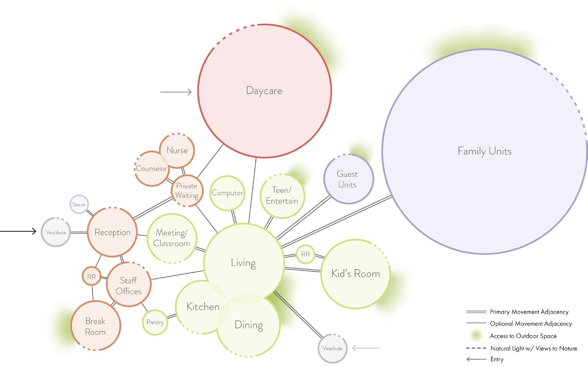Located at the intersection of SW 6th Ave. and Watson Avenue in Topeka, Kansas, just east of the Topeka Zoo, the Co-Housing Shelter provides long-term housing for women and children impacted by domestic violence. The design prioritizes both visual and spatial connections to ensure necessary security precautions, as diagrammed on the right.