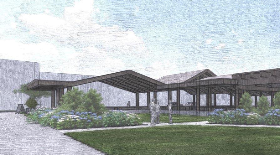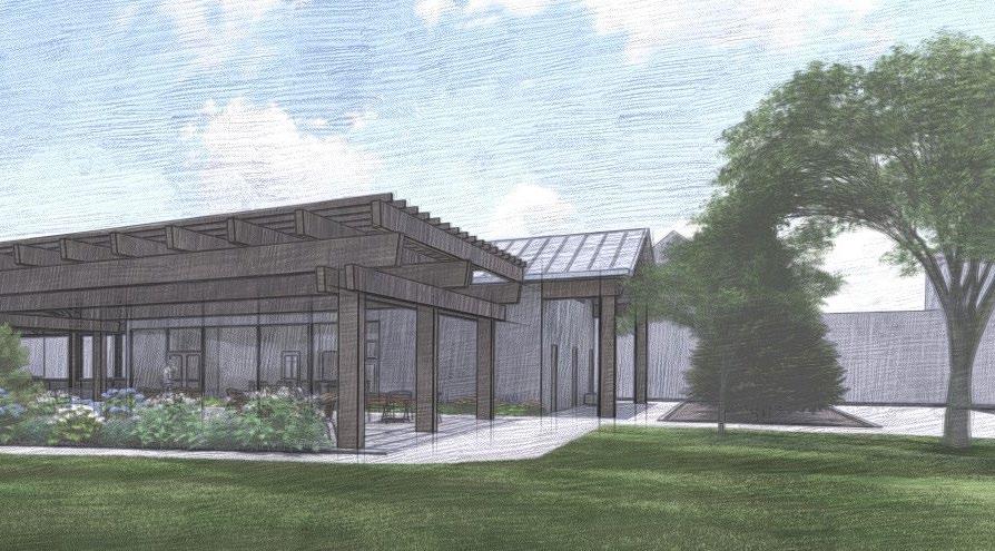 Having exposed wood framing for the underside of the roof structure enhances the building’s rustic appeal but also promotes sustainability by using locally sourced timber.