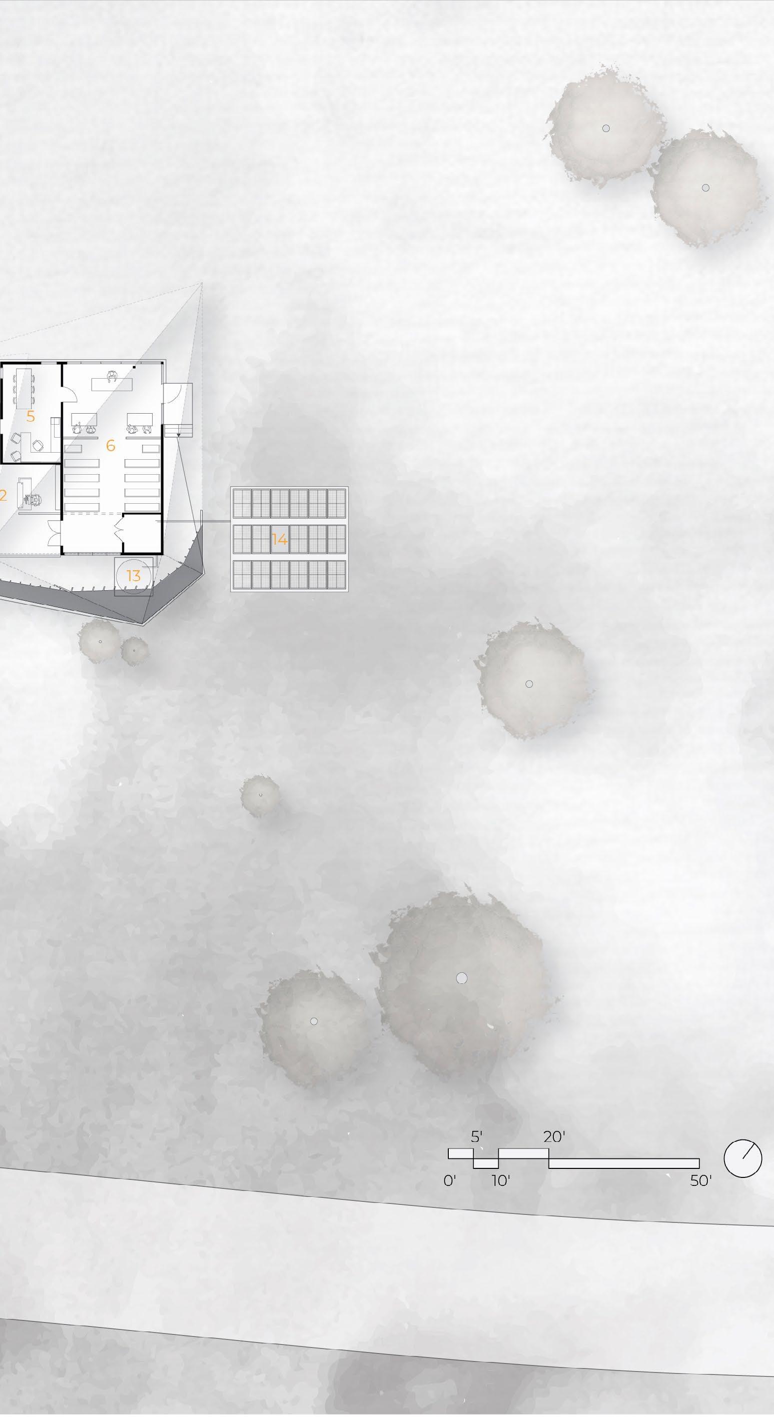 The building program was placed on the site according to a regular grid determined with the site and road relationship. The L shape was created as a result of the preexisting trees.