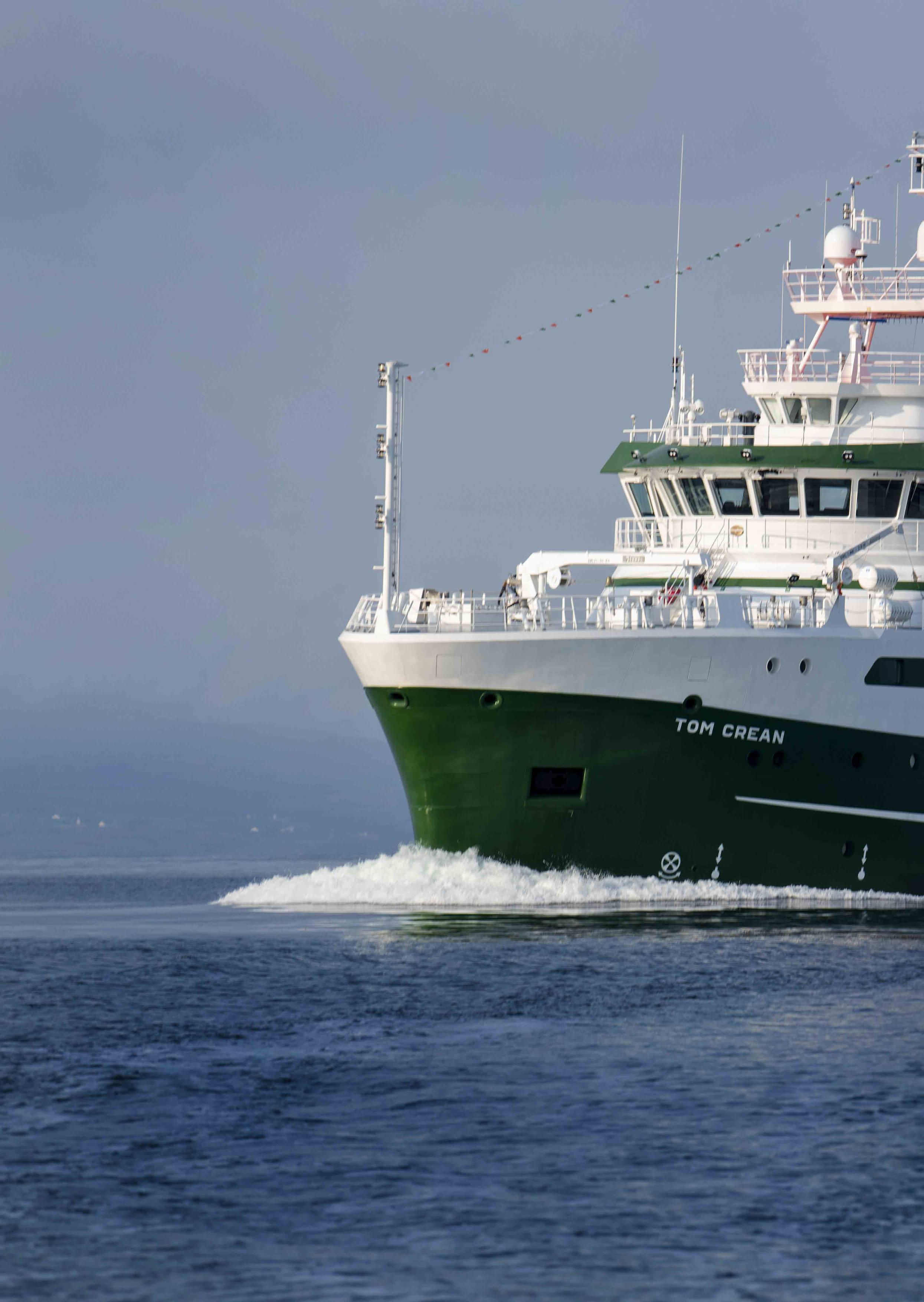 The Tom Crean was designed by Norwegian ship design consultants Skipsteknisk AS and built by Spanish shipyard Astilleros Armon Vigo S.A. It will be a modern, multipurpose, silent vessel, be able to go to sea for at least 21 days at a time, including in harsh sea conditions. The vessel replaces the 31 m Celtic Voyager, which was Ireland’s first purposebuilt research vessel when it was commissioned in 1997.