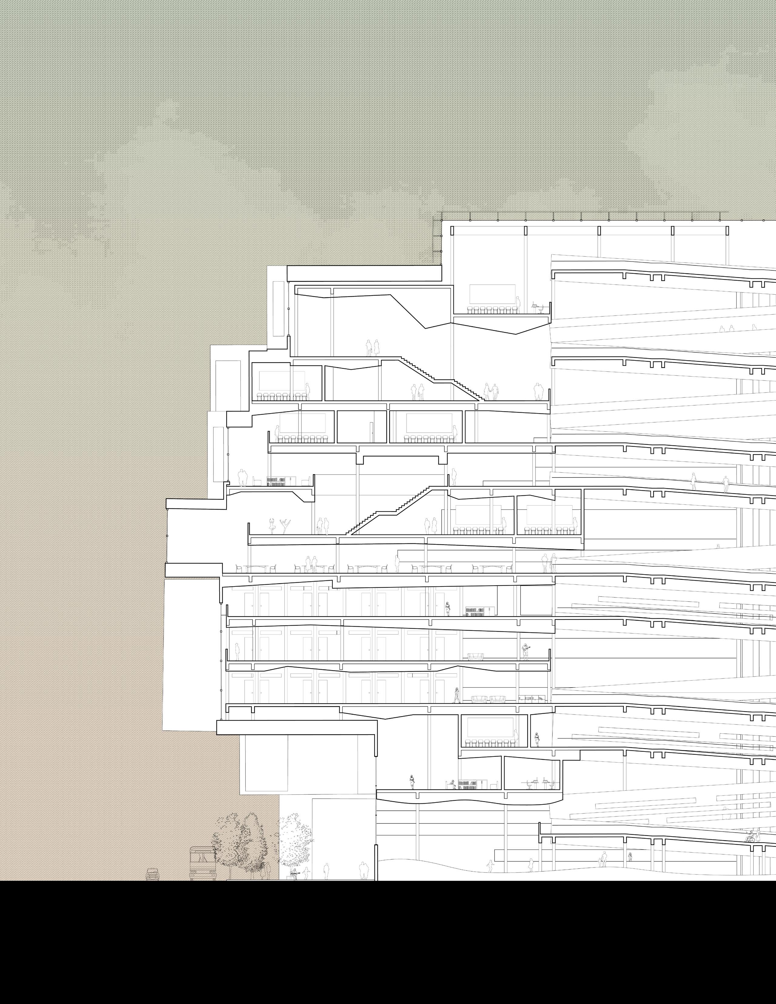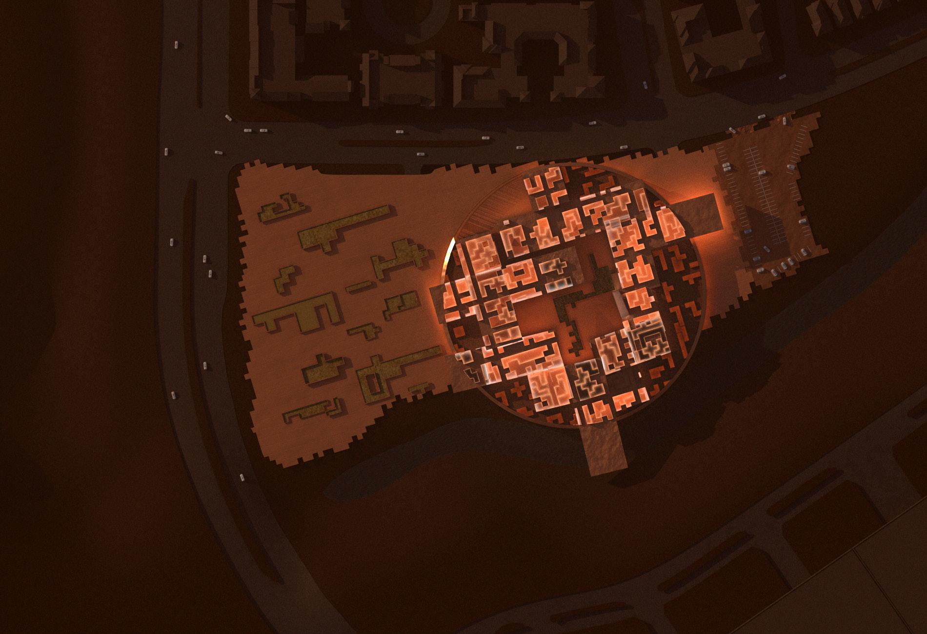 Urban schools must grapple with the demand for a holistic education in a secure space. The mat building is one approach to bring students closer to their environment with a sense of formal unity and cohesion. Urban Ring proposes a single, continuous mass that enables students to produce and perform within the protected boundaries of an elevated disc.