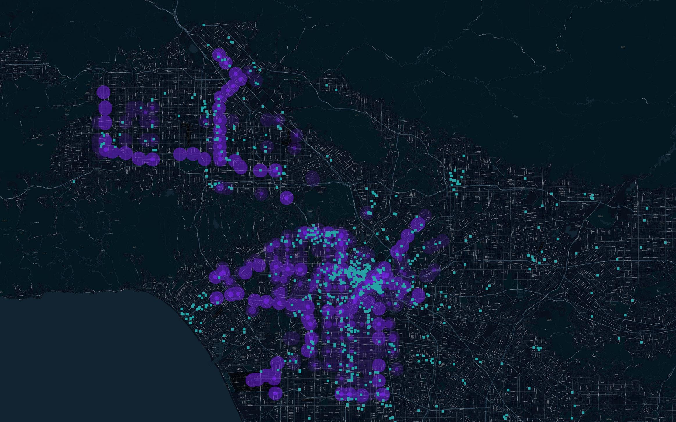 2D map of Los Angeles County with TOC 0.5 mile boundary in purple and Metro lines in green.