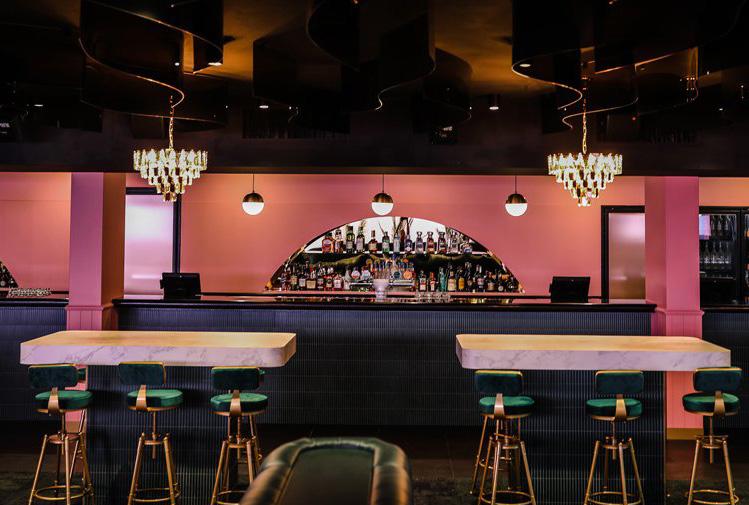 The bars bold interior wears splashes of gold, palm-leaf motifs and dramatic lighting; creating a decadent and vibrant environment. Spatial definition for this design was achieved with custom joinery, selected floor finishes, and level changes, while the pink and green colour palette, gold detailing, textures and finishes, lighting fixtures and ceiling feature all interlace throughout to connect this space as a whole..
