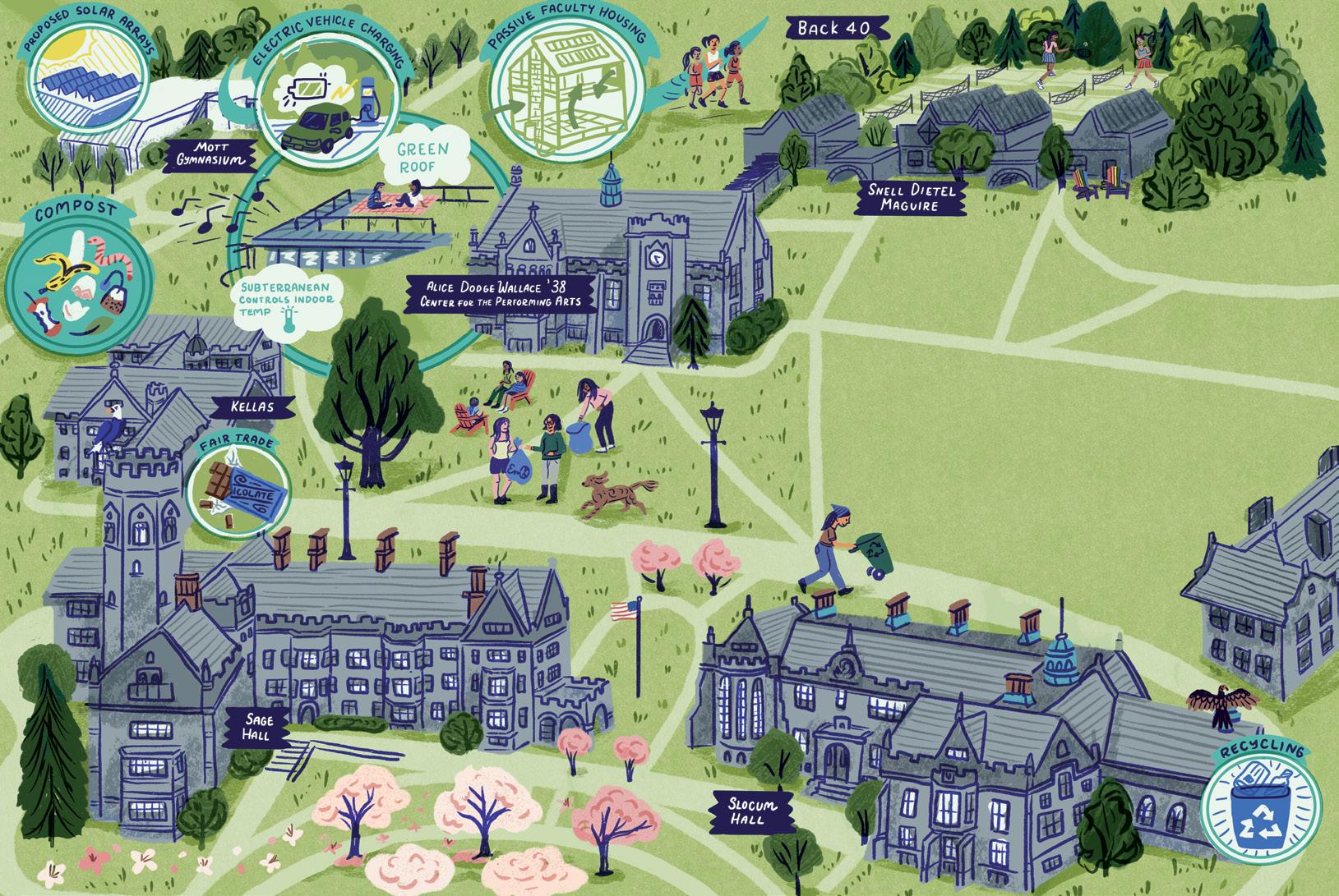 The building of the Alice Dodge Wallace ’38 Performing Arts Center has opened up an opportunity for the school to make large-scale steps toward creating a greener campus. The subterranean architecture of the arts wing, as well as the green roof, will allow for temperature preservation so that, ideally, less energy will be used to power the buildings. The Wallace Center also has implemented greener heating and cooling systems, sourced from an electric power chiller and a heat pump along with a backup coming from the school’s boiler plant.