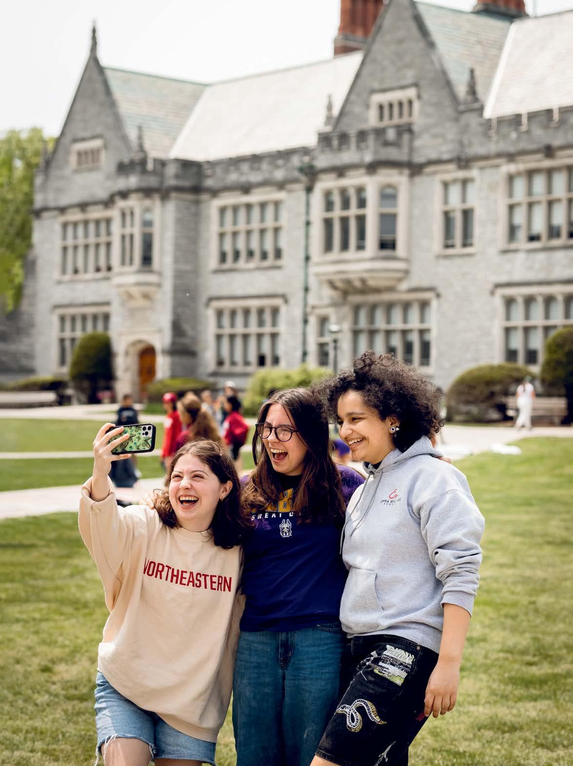 Lennon A. ’23, Anna Kelly G. ’23, and Esme M. ’23 pose for a “selfie” together in their college attire on the Senior Triangle during Chalk Day, an event celebrating the conclusion of the college selection process for Emma Willard seniors.