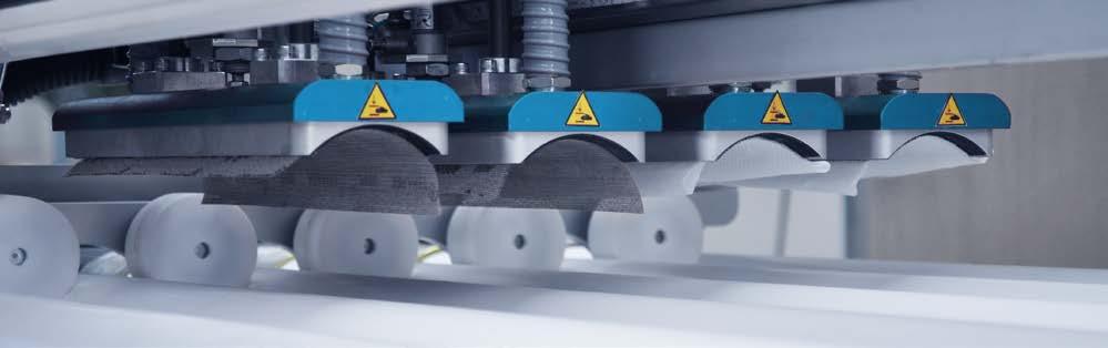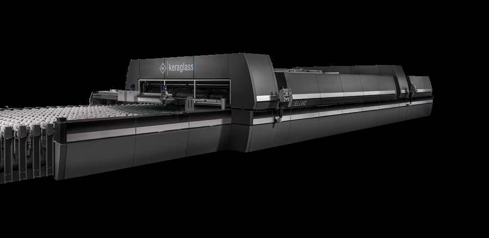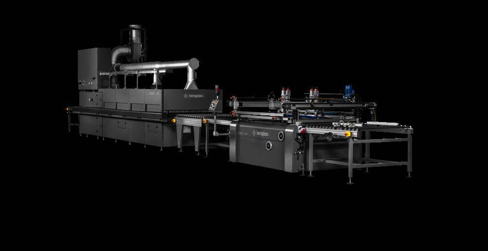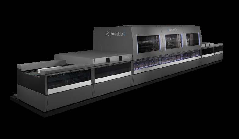 With Dinamica, Keraglass expands its range of glass decoration solutions with an innovative and technologically advanced system designed for next-generation industry. The line combines the flexibility of digital printing with the speed of traditional screen printing. Glass moves beneath fixed colour bars, allowing monochrome or multicolour graphics to be produced in a single pass. This speeds up production and optimises the reproduction of complex images. Ceramic ink, kept in continuous recirculation, ensures quick production restart and constant machine operation, reducing downtime and guaranteeing high productivity. The system also integrates vision technology that detects imperfections and applies real-time corrections. Dinamica is a versatile, highperformance solution ideal for the automotive, household appliance and furnishing sectors, combining aesthetic quality, precision and production efficiency in a single advanced digital printing system.
