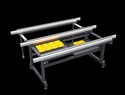 Großer Montagetisch mit modularem Aufbau für Montage und Inline-Handling von Fassadenelementen. Der Montagetisch ist mit zwei Rollenbahnen mit Überzug aus weichem PVC ausgestattet, deren Abstand je nach Breite des Werkstücks verstellt werden kann. Mithilfe eines pneumatischen Klemmsystems werden die Rollen während der Bearbeitungsphasen geklemmt.