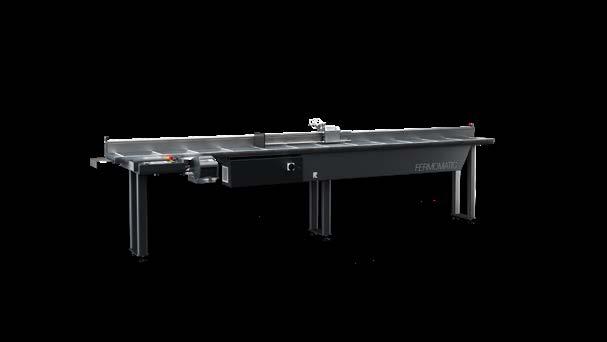 Doppelgehrungssäge mit automatischer Verfahrbewegung des beweglichen Sägeaggregats über einen von einer numerischen Steuerung gesteuerten Brushless-Motor. Pneumatisch gesteuerte Neigung der Sägeaggregate von 90° auf 22°30’ (nach außen) auf zwei festen Positionen oder mit einem optionalen mechanischem Einstellsystem der Zwischenwinkel. Auslegung für Industry 4.0.