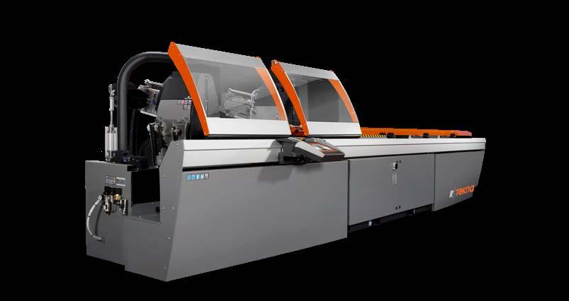 Doppelgehrungssäge mit 3 gesteuerten Achsen mit automatisch verfahrbarem Kopf und Verwaltung der Winkel im Bereich zwischen 15° außen bis 45° innen. Der Sägeblattvorschub erfolgt mittels hydropneumatischen Zylindern. Sägeblatt 550 mm Mit 5 m oder 6 m Nutzschnittlänge erhältlich. Auslegung für Industry 4.0.
