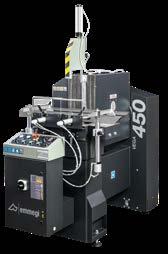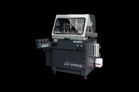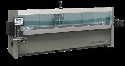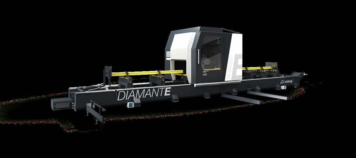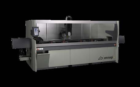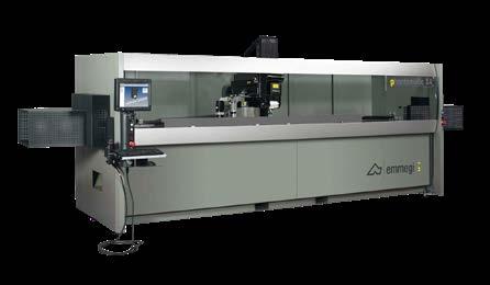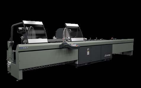 4 eixos CNC e unidade de corte com lâmina em WIDIA. A unidade de corte com lâmina de 250 e 400 mm, executa cortes de 90°; na versão com lâmina de 600 mm, pode executar cortes inclinados até 22°30’ à direita e à esquerda. A unidade de descarga pode ser constituída por uma esteira transportadora, ideal para peças curtas como suportes e dobradiças ou, em alternativa, uma bancada de descarga com extrator automático e sistema automático de inclinação e translação. Predisposição para Smart Factory.