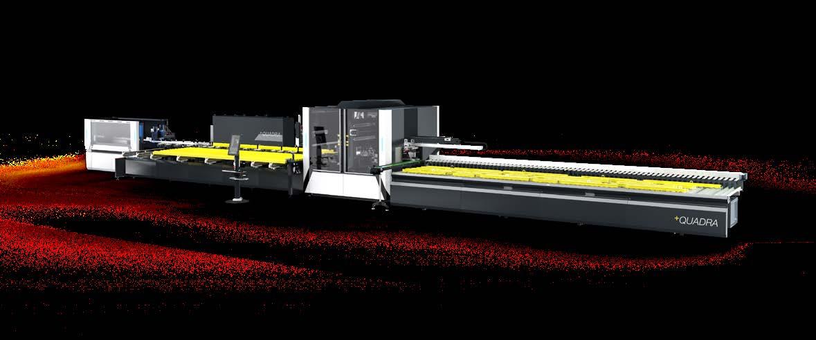 Centro de usinagem com até 20 eixos CNC, projetado para executar trabalhos de corte, fresagem e furação também na cabeça e na parte traseira, em perfis em alumínio e ligas leves. QUADRA é composta por um armazém automático e por um sistema de alimentação para perfis extrudados de até 7,5 m. O módulo de fresagem CNC de 4 eixos é equipado com eletromandris, de 4 a 6, que permitem usinagem de qualquer lado do perfil. O módulo de corte é composto de uma lâmina de 600 mm de diâmetro com movimento de descida em 3 eixos CNC (L1, L2, L3) e uma lâmina de 350 mm de diâmetro com movimento de avanço e rotação em um eixo CNC horizontal (L0, L2, L3). O módulo de encabeçamento opera em dois eixos CNC (L2) ou, em alternativa, está presente um módulo, equipado com uma unidade dupla de furação, que opera em 4 eixos e pode trabalhar na cabeça dos perfis (L3). QUADRA está equipada com um expulsor automático para a transferência do segmento usinado da unidade de corte ao depósito de descarga com um comprimento máximo de 4 m (opcional de 7,5 m). Predisposição para Smart Factory.
