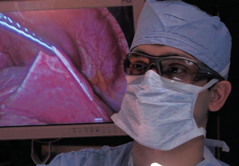 A tiny camera is inserted through a laparoscope during minimally invasive surgery, allowing surgeons to see lung tissue on a video screen. Sancheti is able to remove a small sample of lung tissue for biopsy.