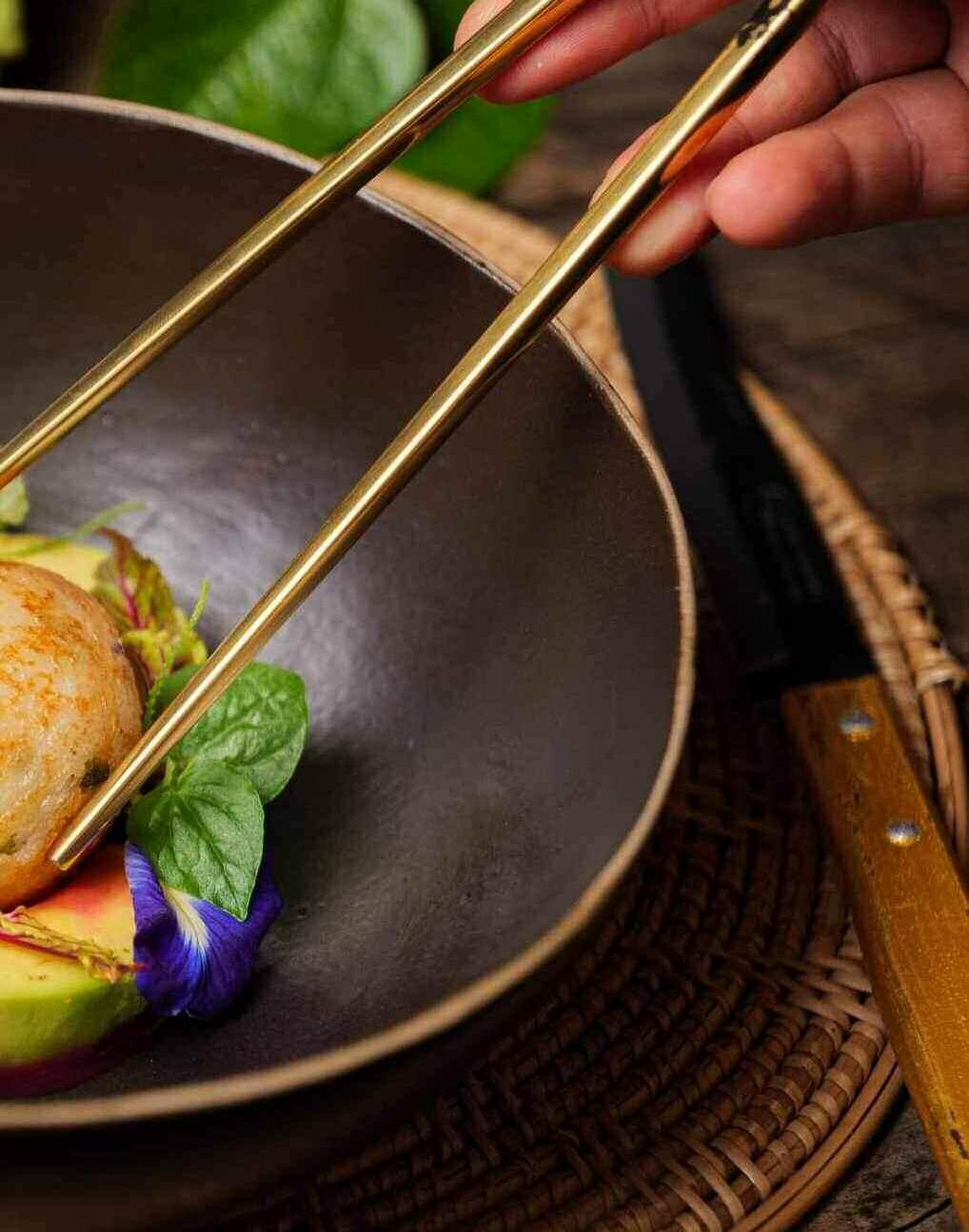 Sul menu colpiscono proposte come il Grill Bee-Hive, un alveare con le sue lar ve, il Nam Kruk, gnocchi di riso leggerissimi con una salsa di barbabietola rossa e mais giallo, il Jungle Sour Beef with Red Tree Ant, manzo marinato e cotto in un brodo di formiche rosse, citronella, pepe di Kampot e basilico santo, l’Angkor Leaf Salad, un misto di foglie del bosco, fiori di banana e boccioli di piante selvatiche, il Kulen Mountain Sausage, una salsiccia di maiale con spezie, fiori di banana e salsa di formiche rosse e il Num Banh Chok, spaghettini di riso con granchio cotto in un brodo di cocco Ogni piatto è la rivisitazione di una cultura alimentare plurisecolare, fatto di sapidità e fragranze, colori e curiosità che confluiscono in un connubio di ineccepibile estetica e straordinaria seduzione