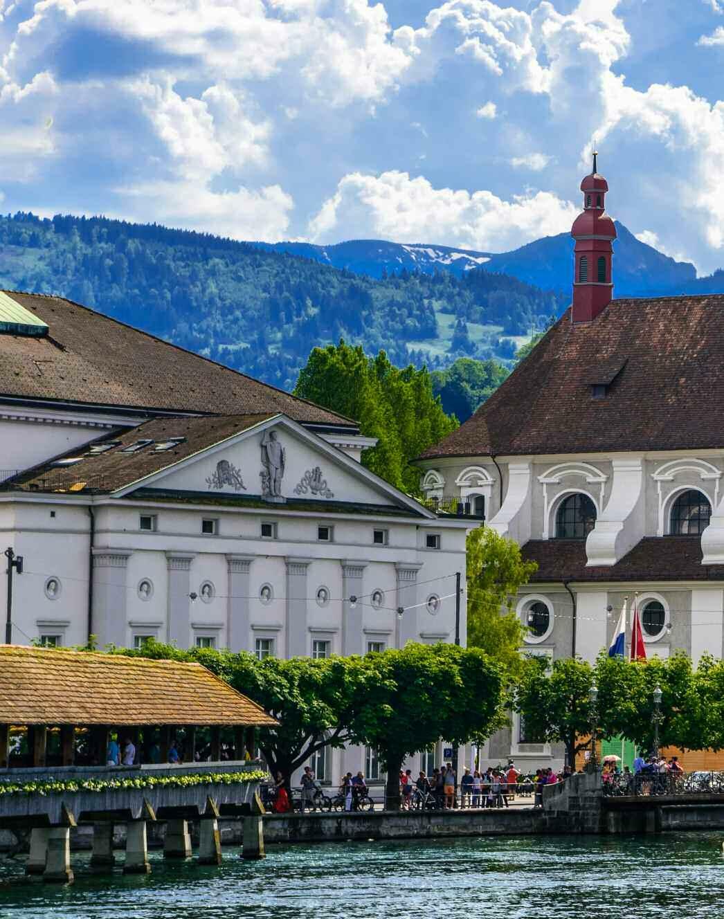 L’edificio di Nouvel, in vetro, acciaio e tetti a sbalzo, racchiude il Museo d’arte Contemporanea, un ristorante e una sala concerto da 1.800 posti, che per la sua acustica è stata considerata, dal grande Claudio Abbado, come una delle migliori del mondo E facendo una passeggiata alle prime luci del giorno lungo il lago, è davvero colma di fascino la vista della torre ottagonale che fu usata come archivio, te soreria, prigione e cella per torture, oggi divenuto il simbolo della città, come dell’antico e caratteristico “Kapellbrucke” che collega la parte vecchia con quella nuova della città Duecento metri di storia in legno e, nel sottotetto, dipinti seicenteschi che raccontano vite di santi, leggende e vicende storiche. Una sorta di memoria collettiva che, attraverso queste pitture, come tessere di un immenso mosaico, danno il volto alla città Siamo nel centro urbano, e attraversare il fiume reuss su quel ponte di legno dalla sua forma unica e inconfon dibile, sempre guarnito da vasi fioriti, con colori che cambiano ogni anno, è un passaggio davvero unico ed esaltante.