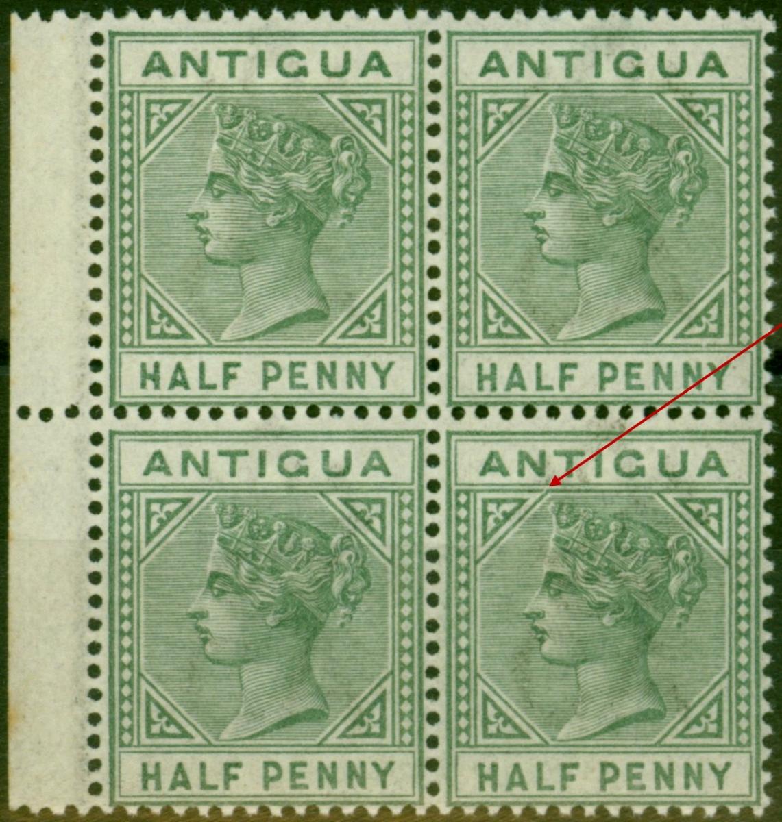 Antigua 1882 1/2d Dull Green SG21a 'Detached Triangle' in a V.F MNH Block of 4