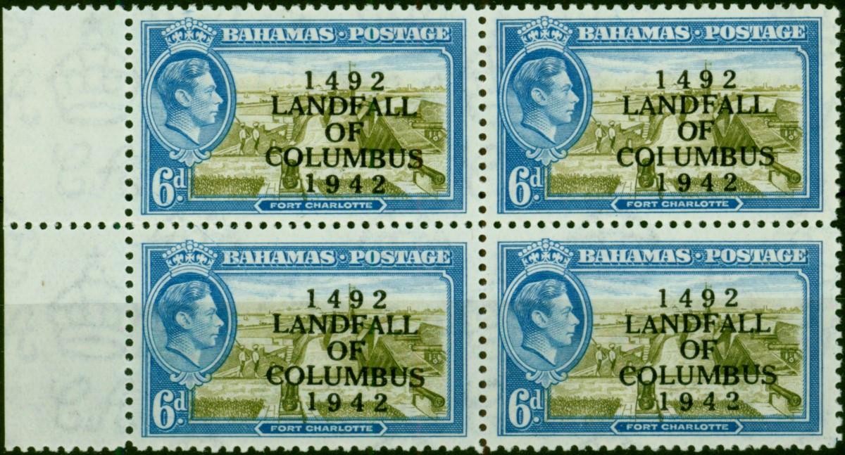 Bahamas 1942 6d Olive-Green & Light Blue SG169a 'Coiumbus' Flaw Fine LMM Block of 4