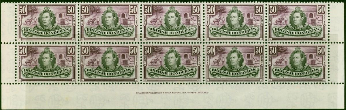 British Honduras 1938 50c Black & Purple SG158 V.F MNH Corner Imprint Block of 10