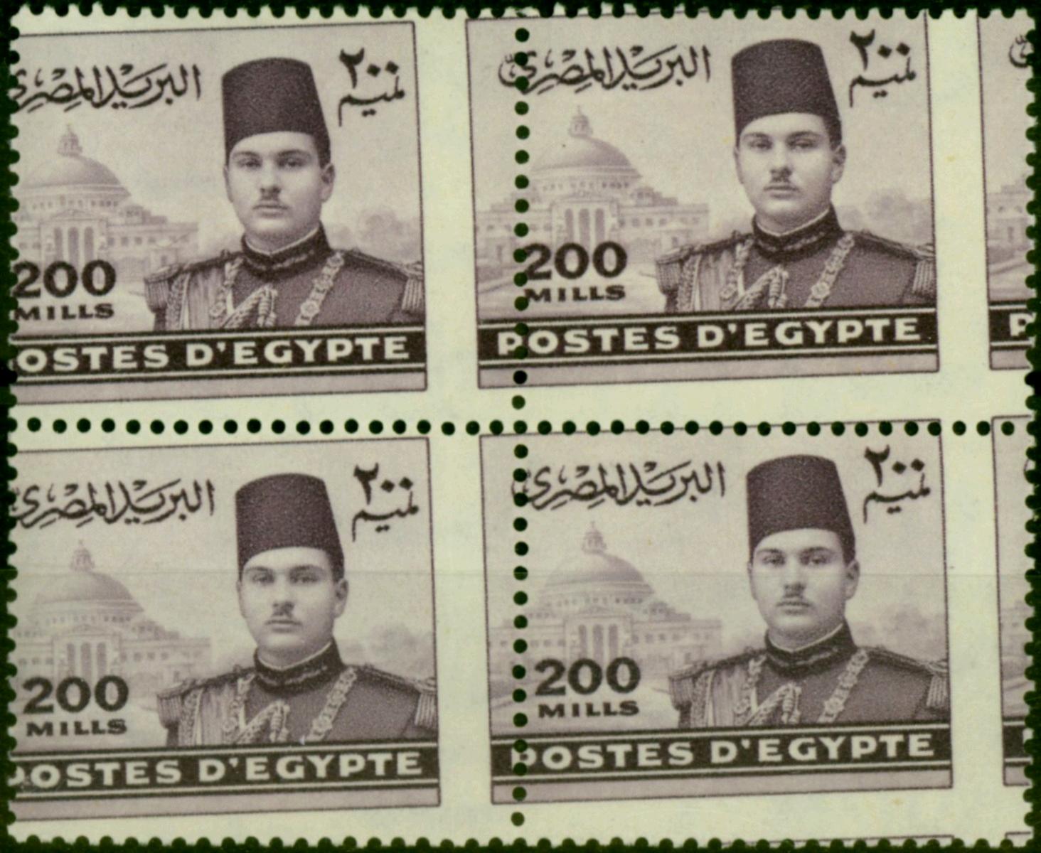 Egypt 1939 200m Violet SG281Var Spectacular Mis-Perf Block of 4 ExRoyal Collection Superb MNH