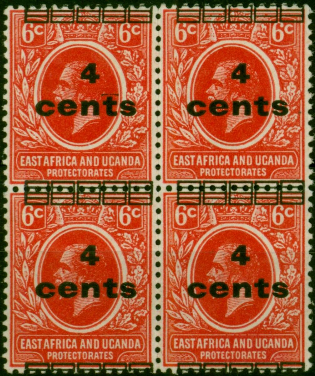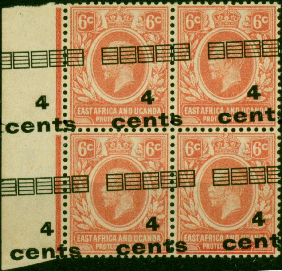 KUT 1919 4c on 6c Scarlet SG64var Significant Sloping Down/Left Shift Good MNH Block