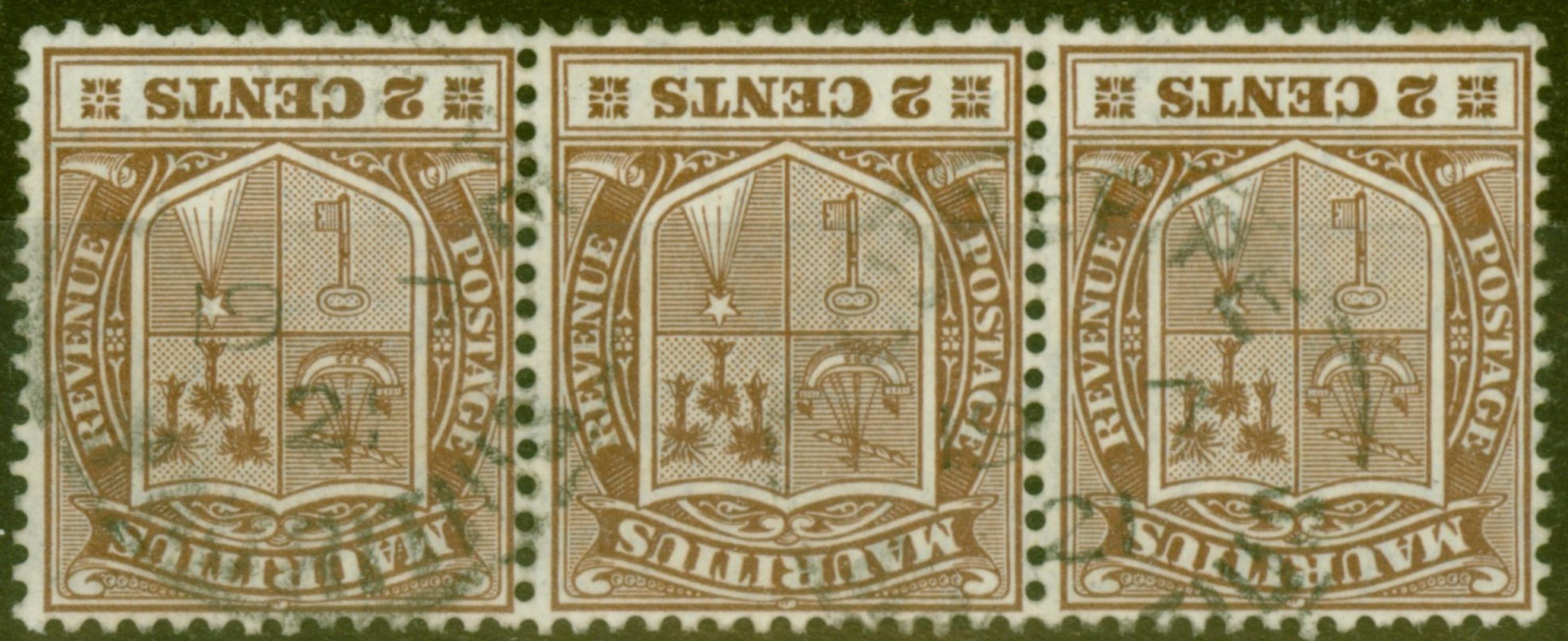 Mauritius 1910 2c Brown SG182w Wmk Inverted Fine Used Strip of 3 Scarce Multiple
