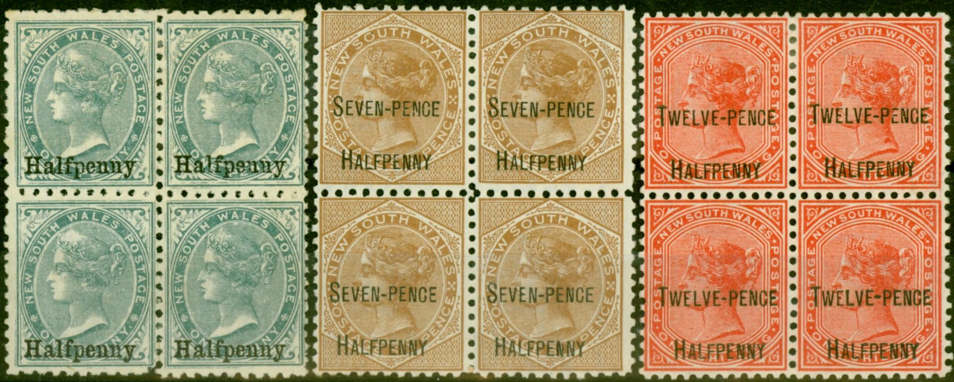 N.S.W 1891 Surcharge Set of 3 SG266-268c in Fine LMM & MNH Blocks of 4