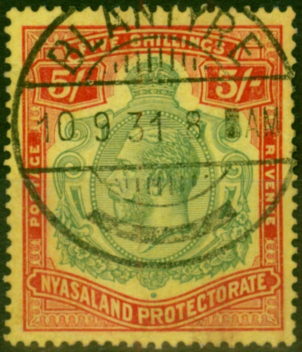 Nyasaland 1929 5s Green & RedYellow SG112c 'Nick in Top Right Scroll' V.F.U